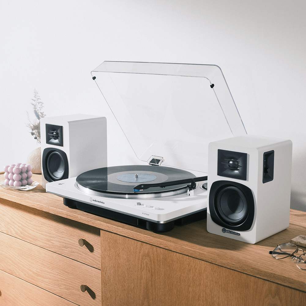 AT-SP3X 是一款針對鐵三角旗下的黑膠唱頭、唱盤等類比產品進行最合適音質設計的主動式喇叭。能忠實地將由唱針拾取的聲音訊號輸出為聲音。產品支援藍牙連接,可以輕鬆地以無線方式享受每一張黑膠唱片蘊藏的美好音樂,而無需擔心唱盤的配線佈置。同時也支援多重配對功能,即使使用唱盤聆聽音樂也無需在需使用智慧型手機時另行配對。自1962年成立以來,我們一直致力於呈現鐵三角特有的美妙聲音世界。