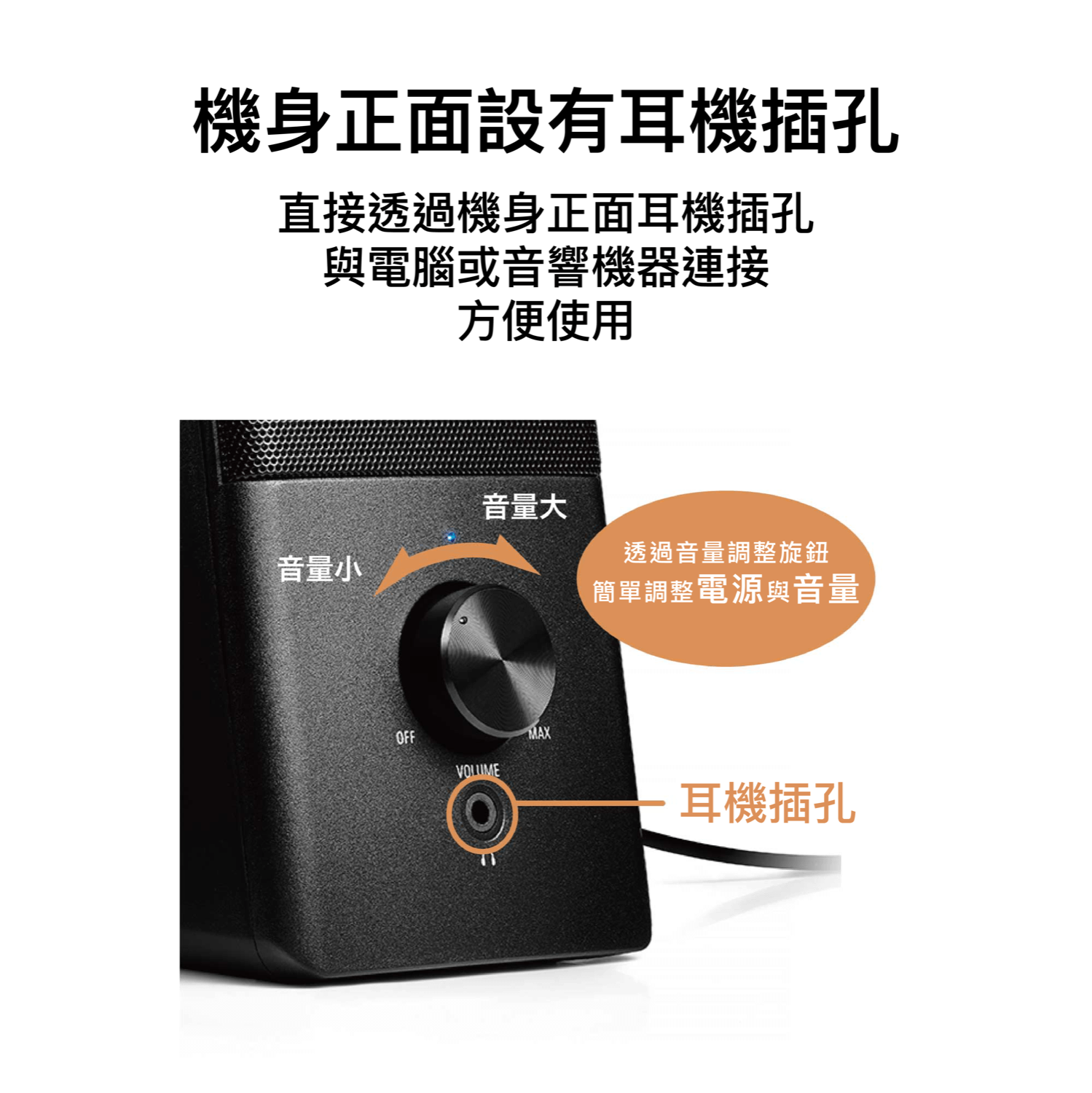 於機身正面設置音量/開關一體化的旋鈕,
