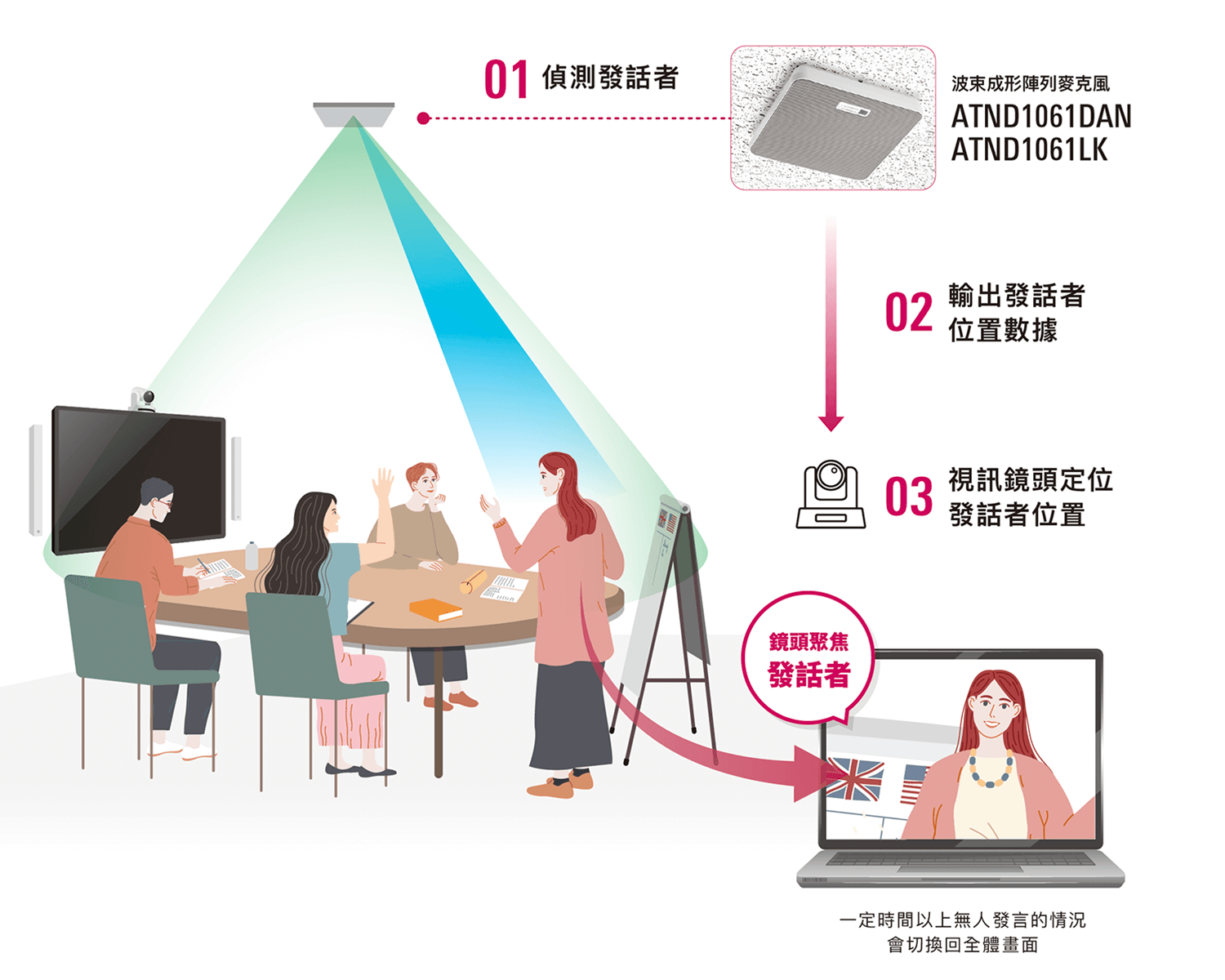 透過波束成形麥克風技術(PAT)檢測出發話者位置數據,定位至發話者。可活用於線上會議、線上課程等場合中。