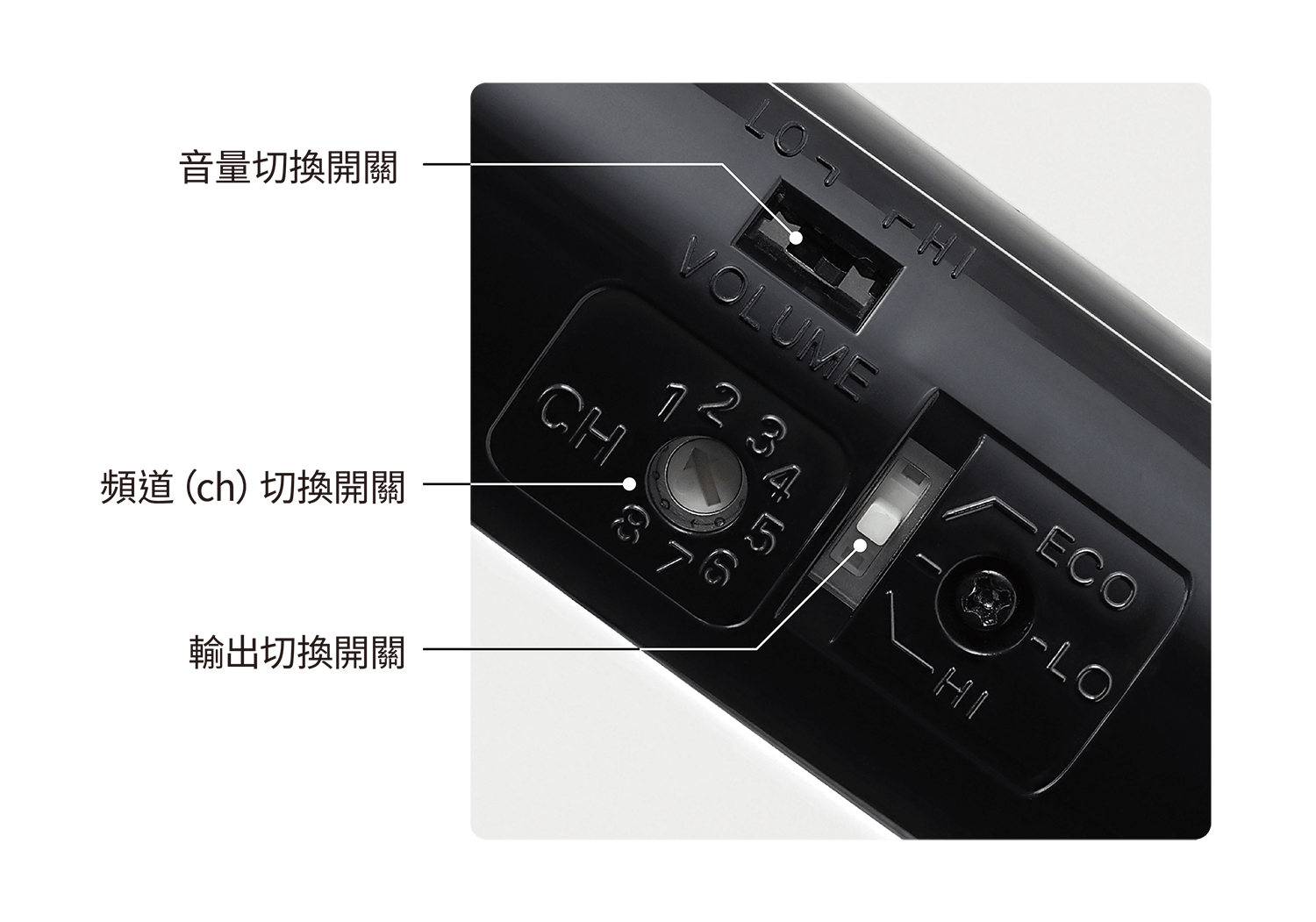 請依照所使用的頻道,透過接收器側邊的頻道切換開關選擇對應的頻率。