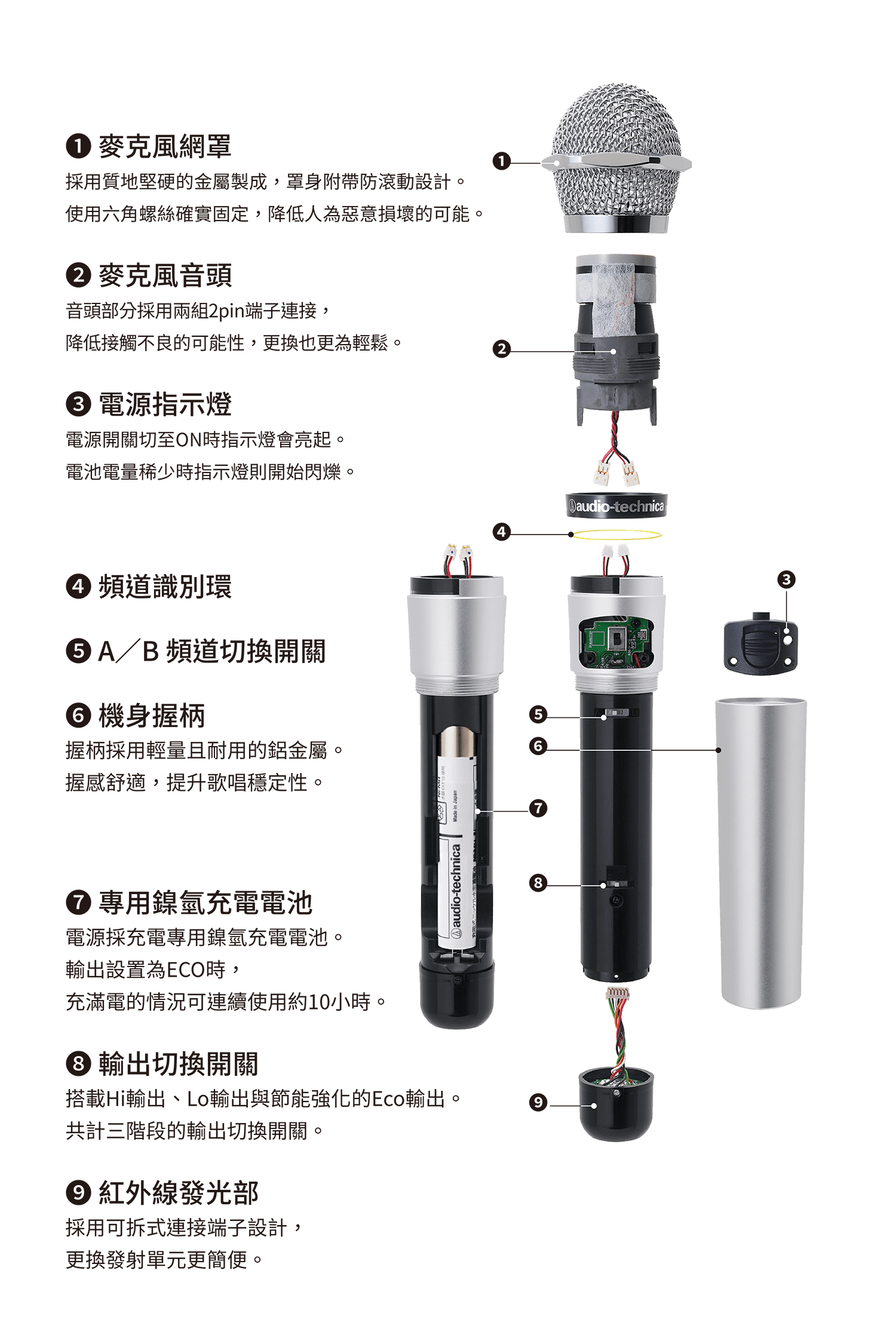 麥克風內設有輸出切換開關,可根據實際使用環境調整紅外線的輸出功率。在HI模式下,紅外線的最遠傳輸距離約為16公尺,在LO模式下約為12公尺。另外,能夠強化省電效果的節能設計ECO模式,傳輸距離約可達10公尺。
