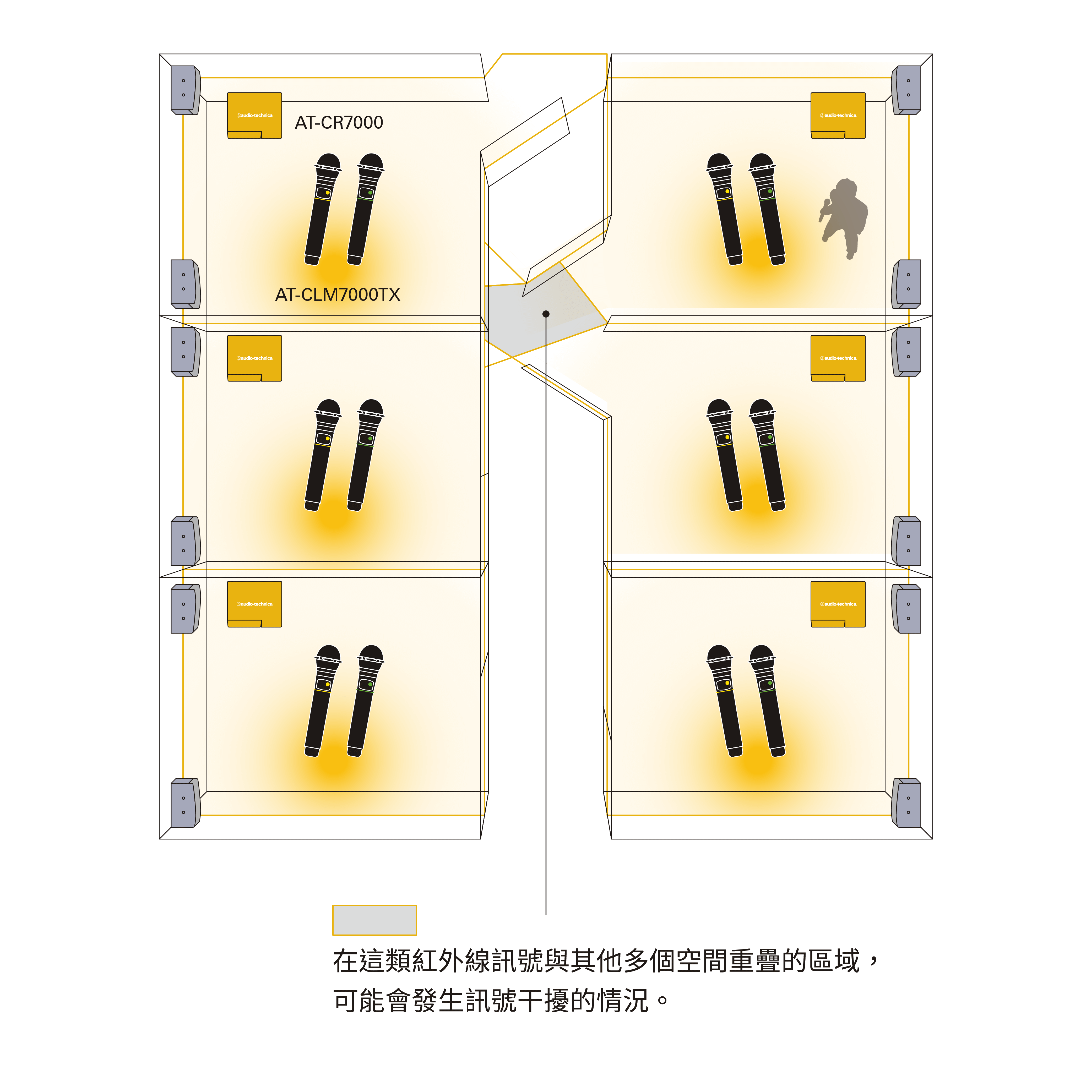 在視覺上被區隔的空間中,可以同時使用多支麥克風。若為開放式空間(可互相看見的環境),可將「CLM7000系列與CLM7700系列」進行搭配使用。