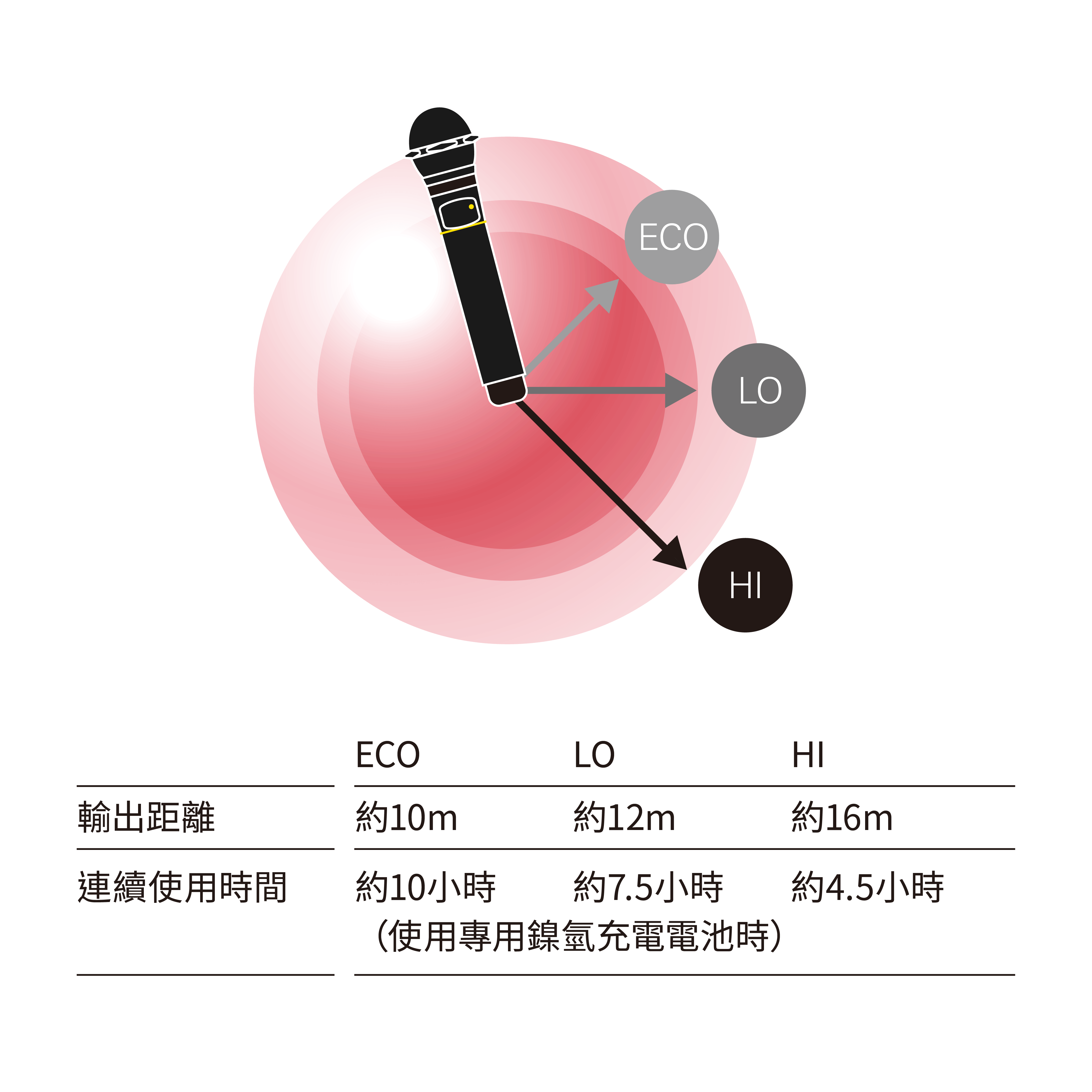 - 省電設計,紅外線輸可出切換為 3 個等級(ECO/LO/HI),ECO模式最長可連續使用長達10小時。