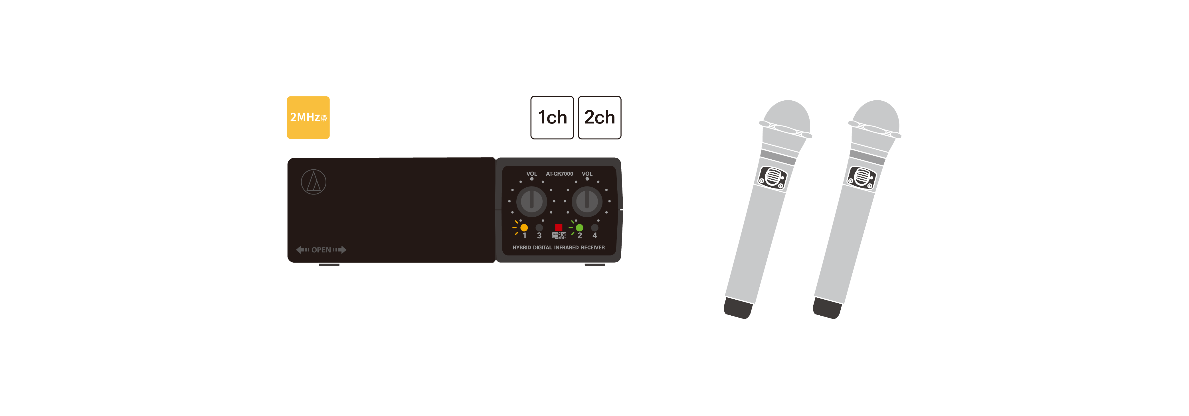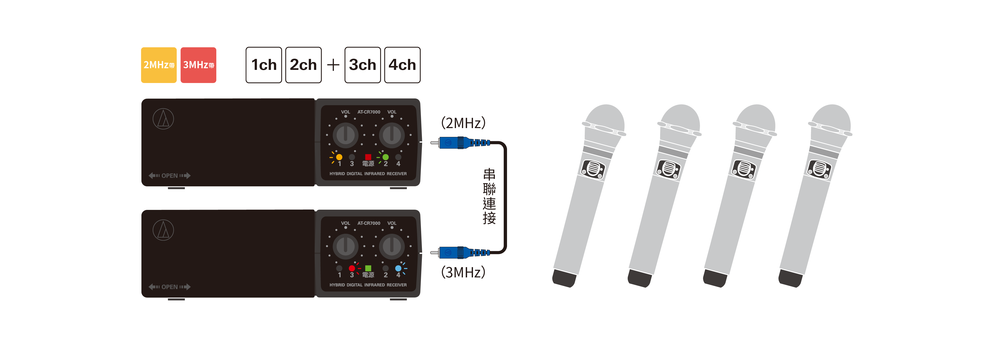 - 當2MHz 頻段與3MHz 頻段同時用,一個空間最多可以同時使用兩台接收主機, 4 隻手握麥克風。