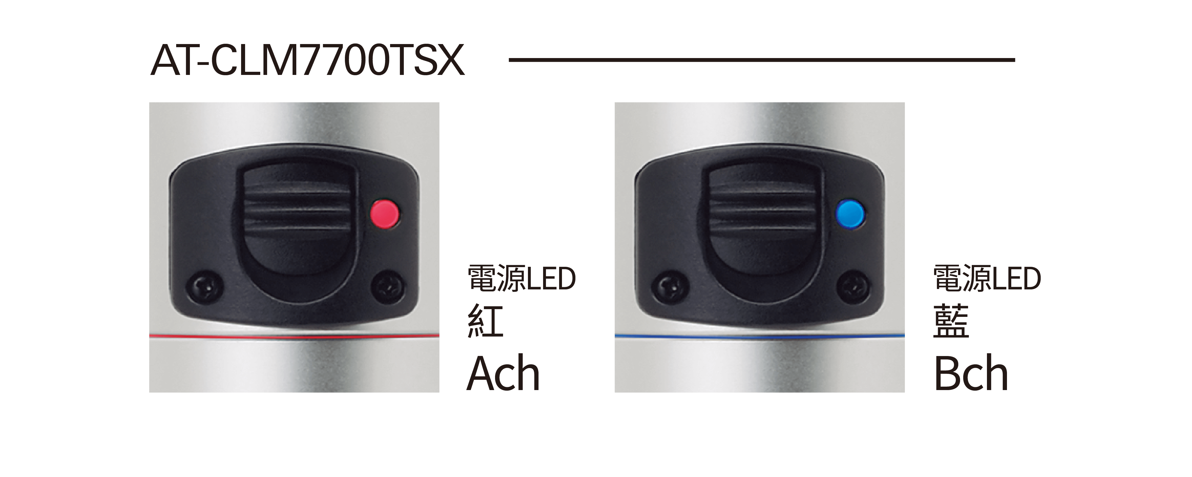 產品支援 A/B 頻道切換功能,可透過機身上的電源指示LED燈顯示目前所使用的頻道。搭配隨附的頻道識別環,在依所設定的頻道安裝後,即使處於電源關閉狀態下,也能一眼辨識頻道設定。