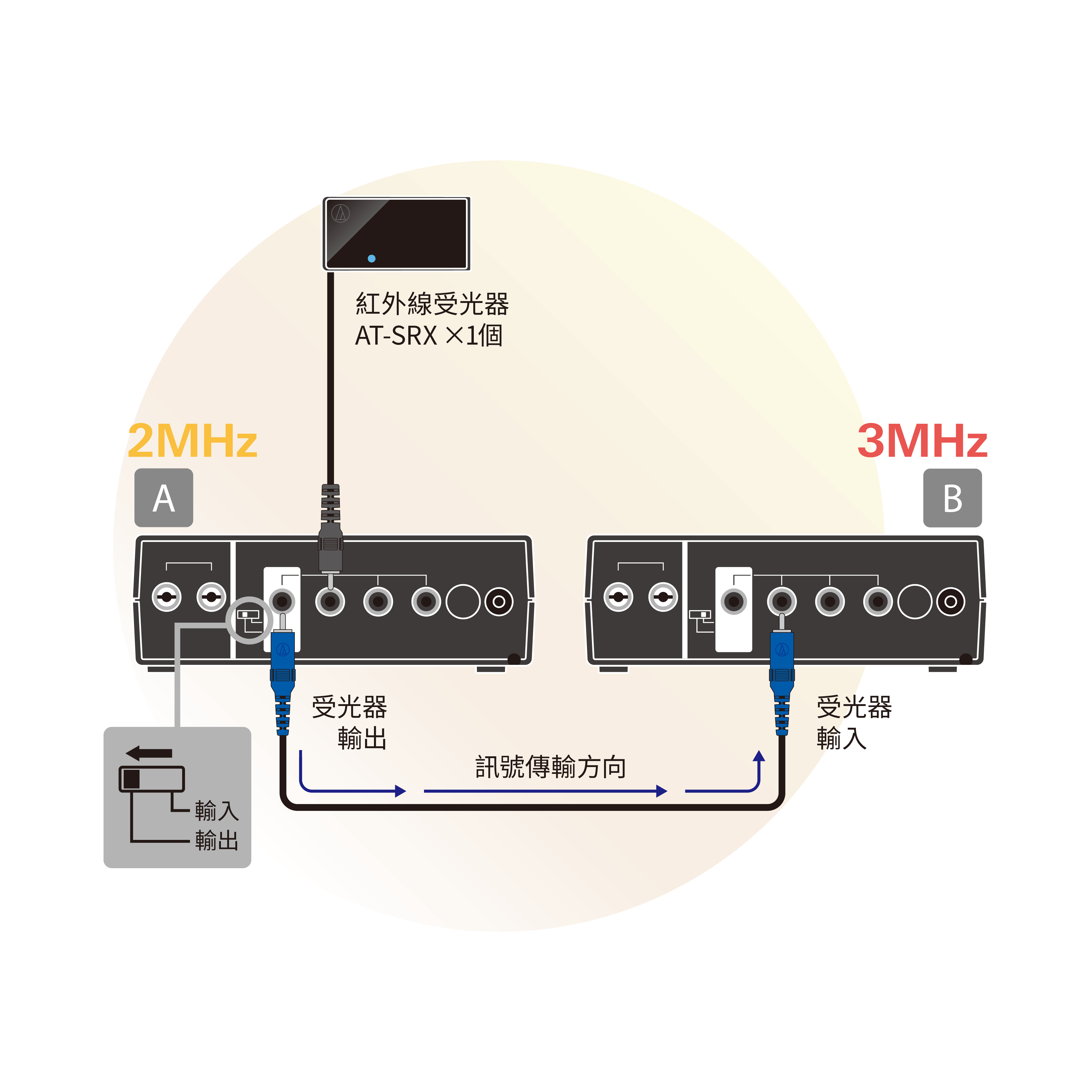 使用一條專用連接導線AT-CAS1,將紅外線受光器的信號從接收器A傳輸至接收器B。