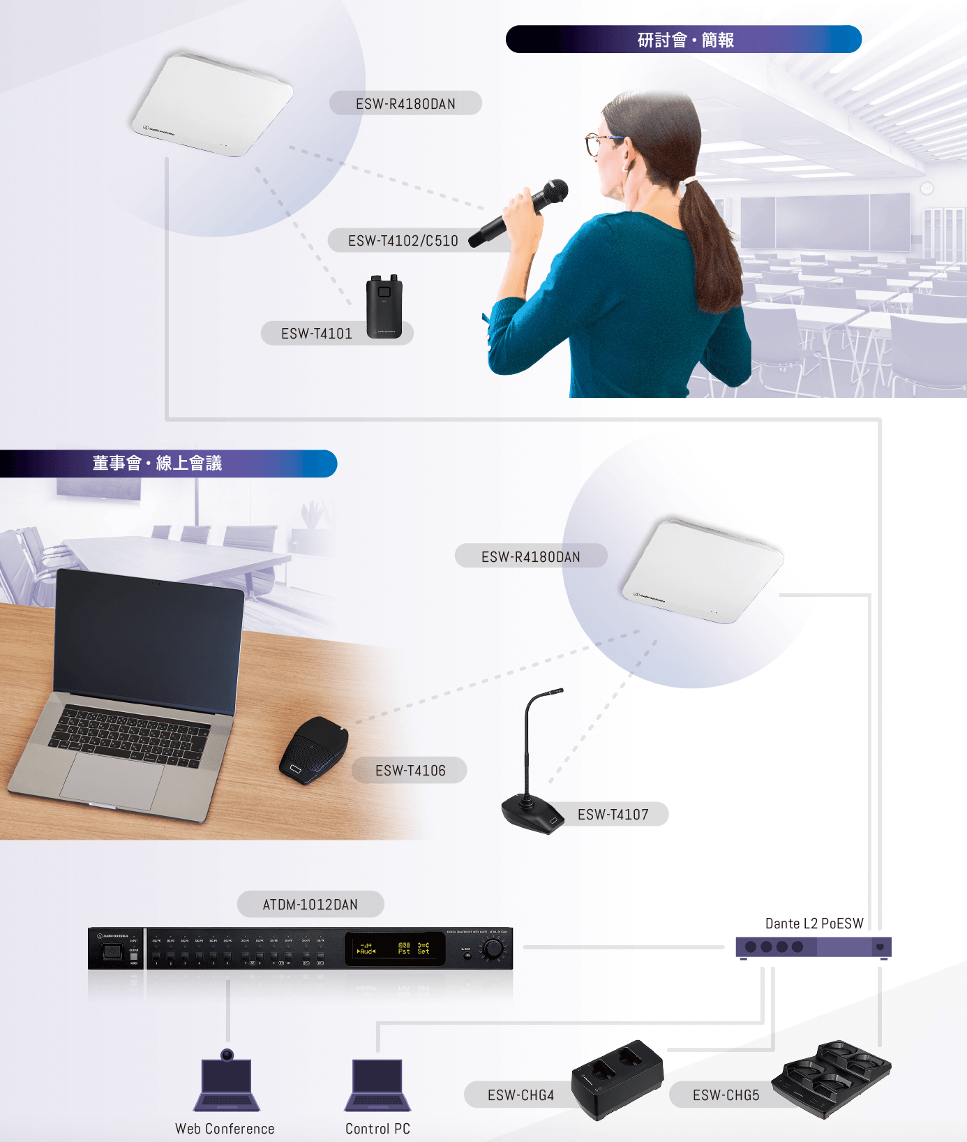 接收器選用易於融入室內裝潢的白色,也能安裝在支架上搬運移動。即使是在租借型會議室或多功能室等等,現場佈置或參加人數有可能會變動的場所,也可配合需求來改變配置。高輸出發射器覆蓋的範圍相當寬廣。接收器的各個頻道最多能事先登錄 6 台發射器,因此可以根據用途選擇適合的發射器,例如研討會用以及會議用等等。