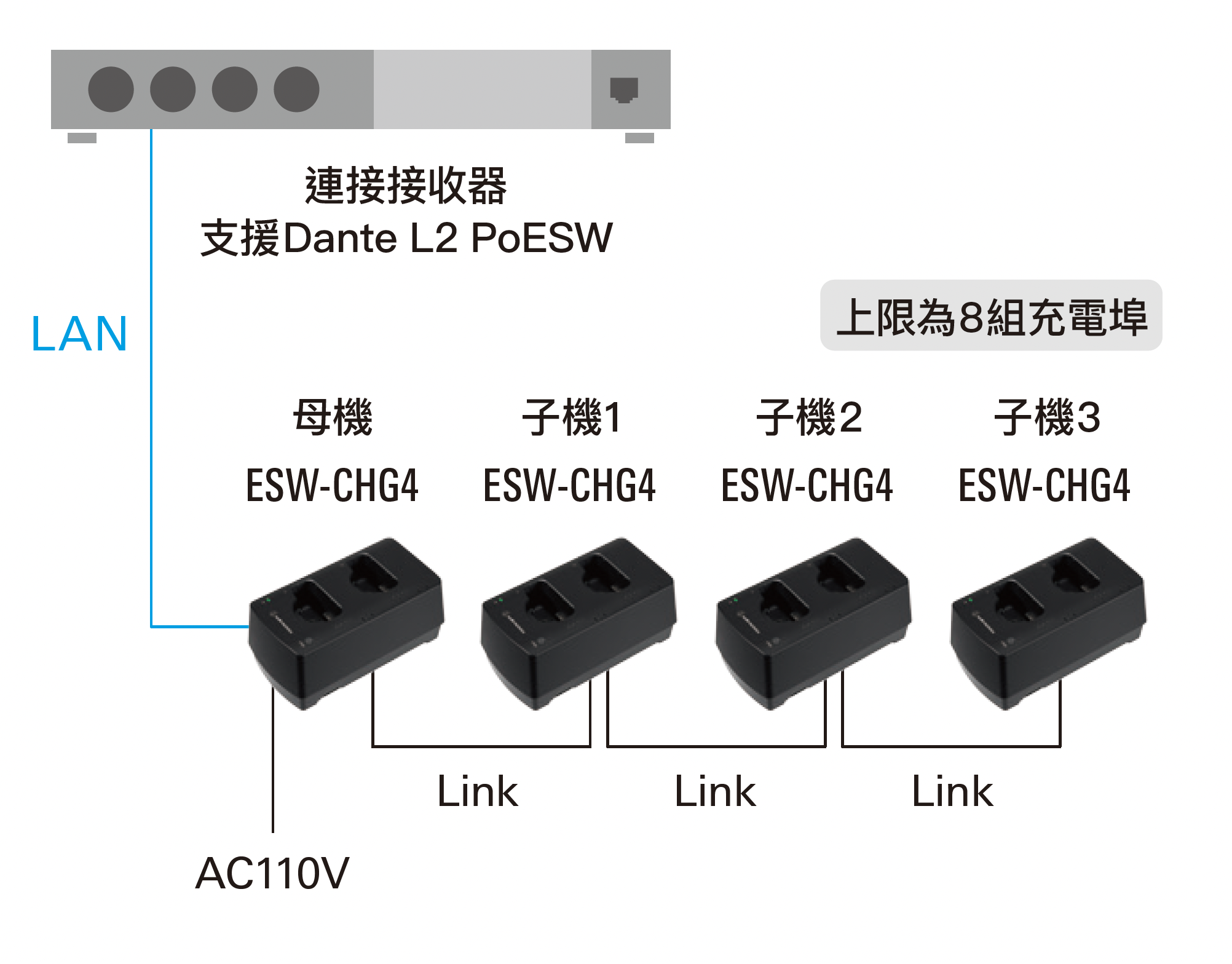 - 最多可連接 8 個充電埠(4 台充電器)。只需一組 AC 變壓器以及一條網路線即可簡單連接。