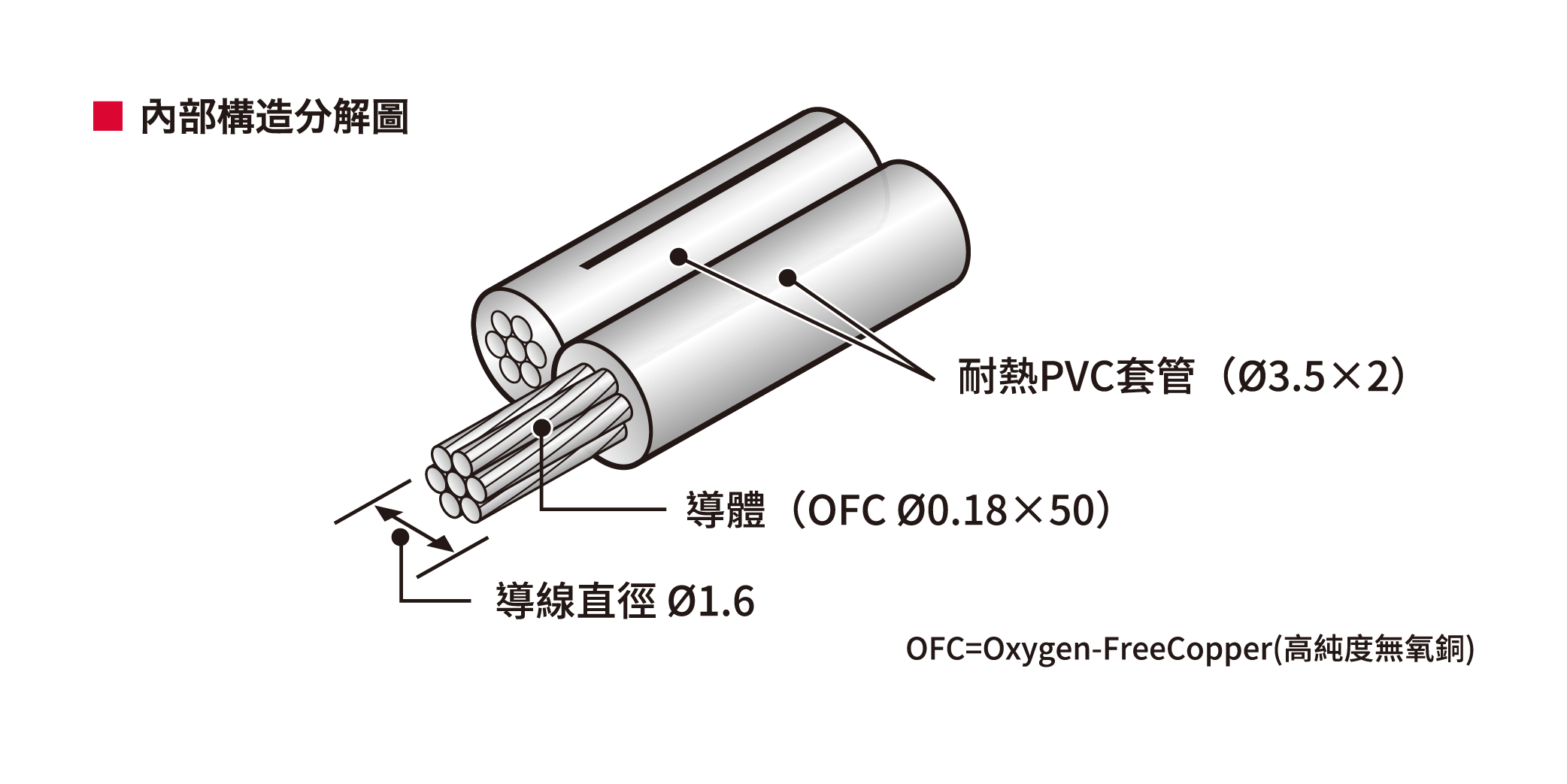 採用柔軟度佳且耐熱可達90℃的保護套管,增加耐用性。 - OFC導體
