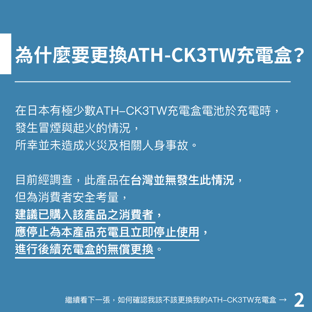 敝公司於2019年11⽉發售的ATH-CK3TW 真無線⽿機,在⽇本有極少數產品的充電盒電池於充電時,發⽣冒煙與起⽕的情況,所幸並未造成⽕災及相關⼈⾝事故。
