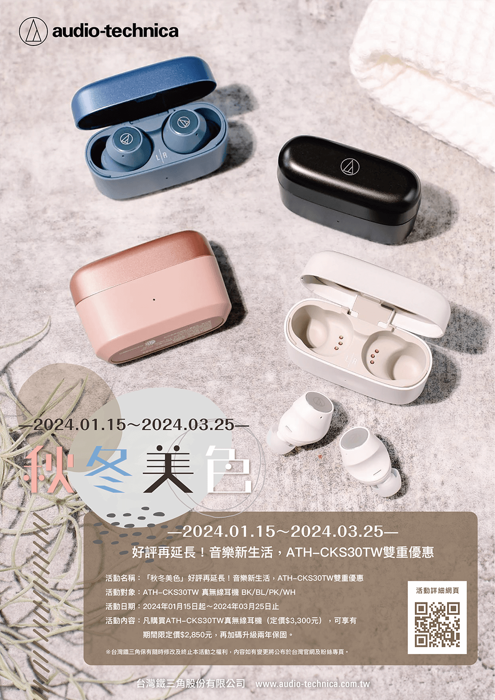 活動名稱:「秋冬美色」好評再延長!音樂新生活,ATH-CKS30TW雙重優惠