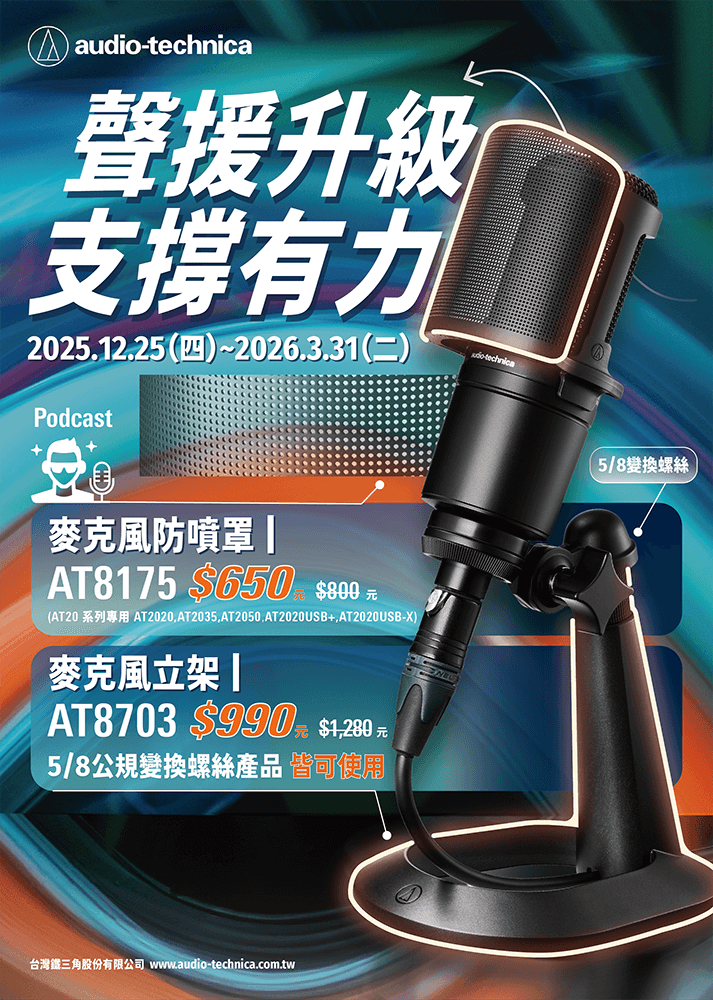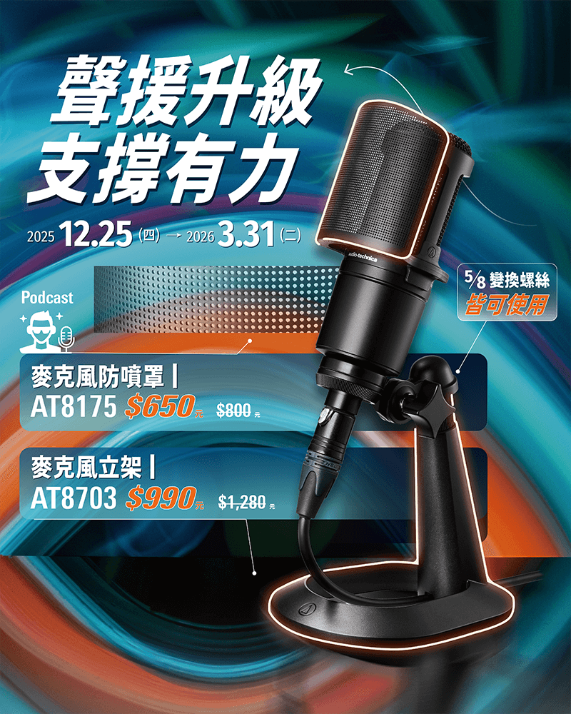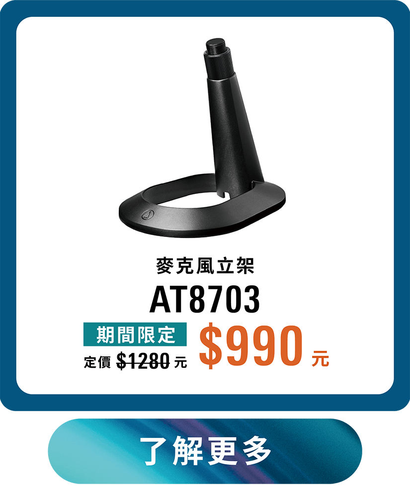 活動內容:於期間內購買下列指定商品,即享有期間限定價。AT8703 麥克風立架 期間限定價NT$990元(定價NT$1,280元)、AT8175 麥克風防噴罩 期間限定價NT$650元(定價NT$800元)