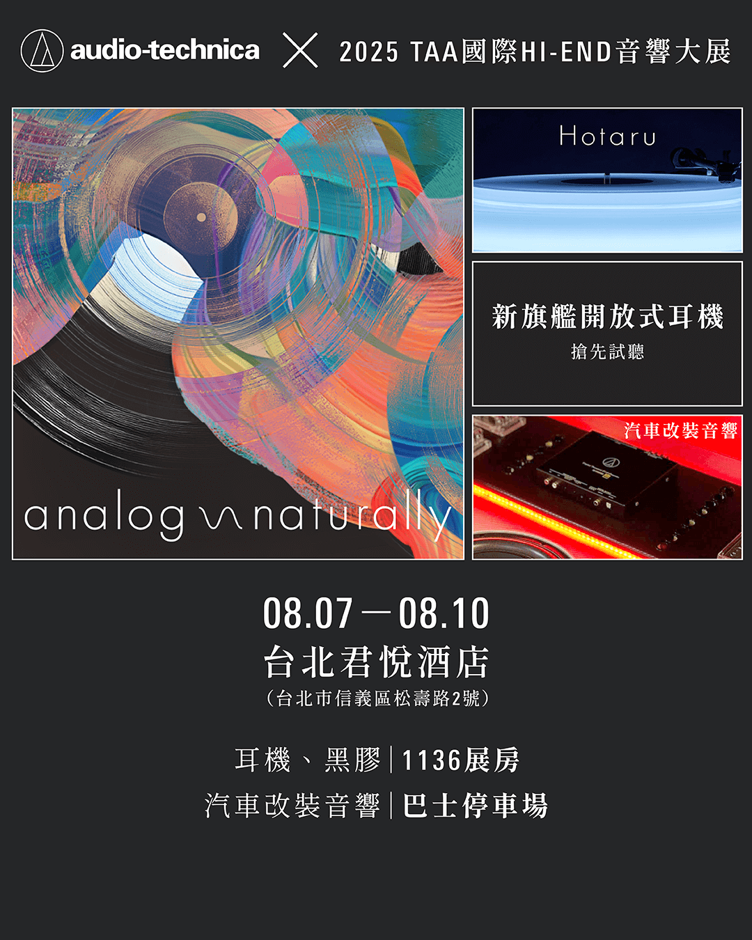 Audio-Technica鐵三角將參加於8月7日(四)起至8月10日(日)止於台北君悅酒店所舉辦之2025 TAA 國際 HI-END 音響大展,本次參展鐵三角帶來三大產品方向,分別為耳機產品、黑膠產品以及汽車改裝音響產品。