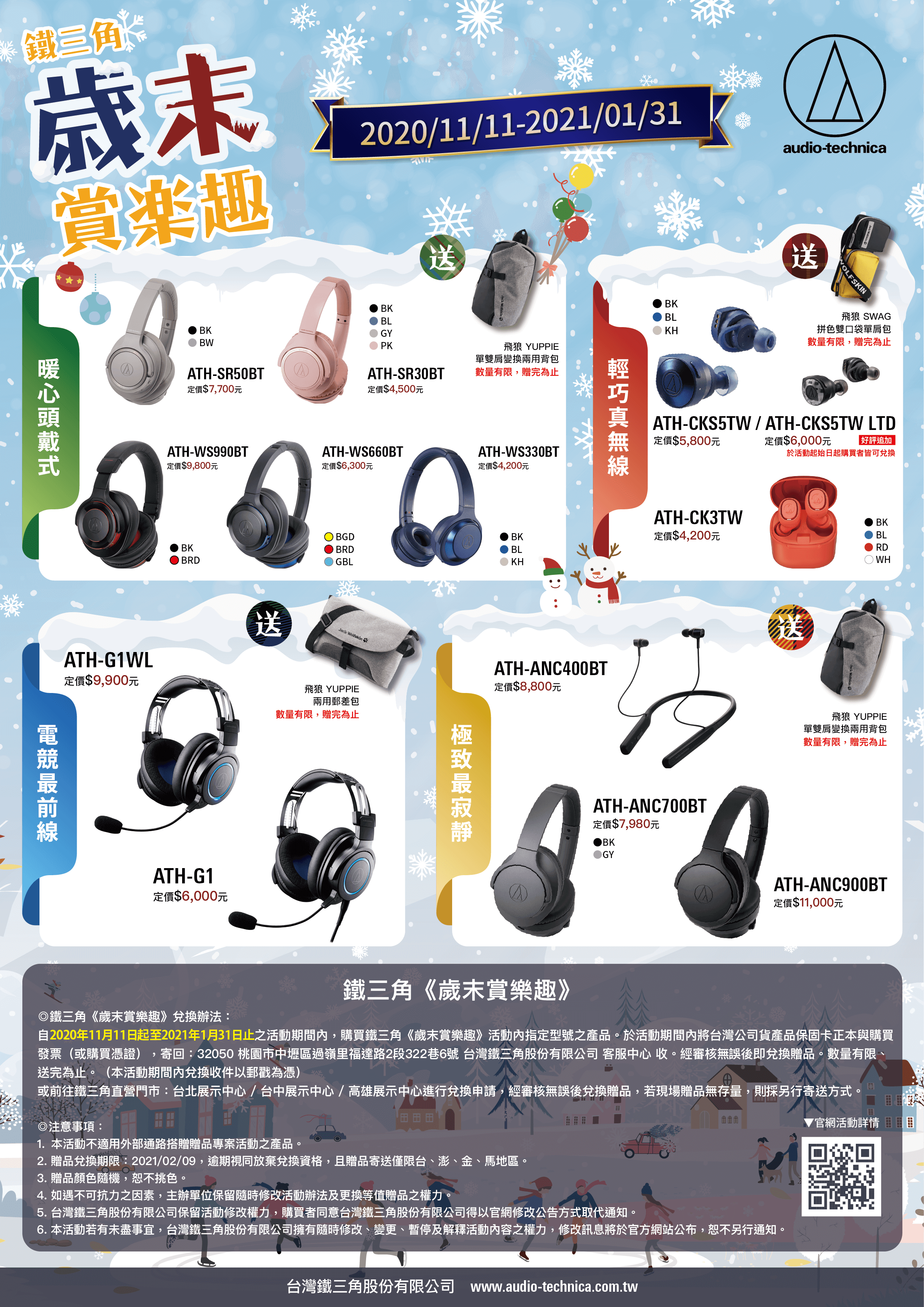 即日起至2021年1月31日止之活動期間內,購買鐵三角《歲末賞樂趣》活動內指定型號之產品。於活動期間內將台灣公司貨產品保固卡正本與購買發票(或購買憑證),寄回:32050 桃園市中壢區過嶺里福達路2段322巷6號 台灣鐵三角股份有限公司 客服中心 收。經審核無誤後即兌換贈品,數量有限,送完為止。(本活動期間內兌換收件以郵戳為憑)
