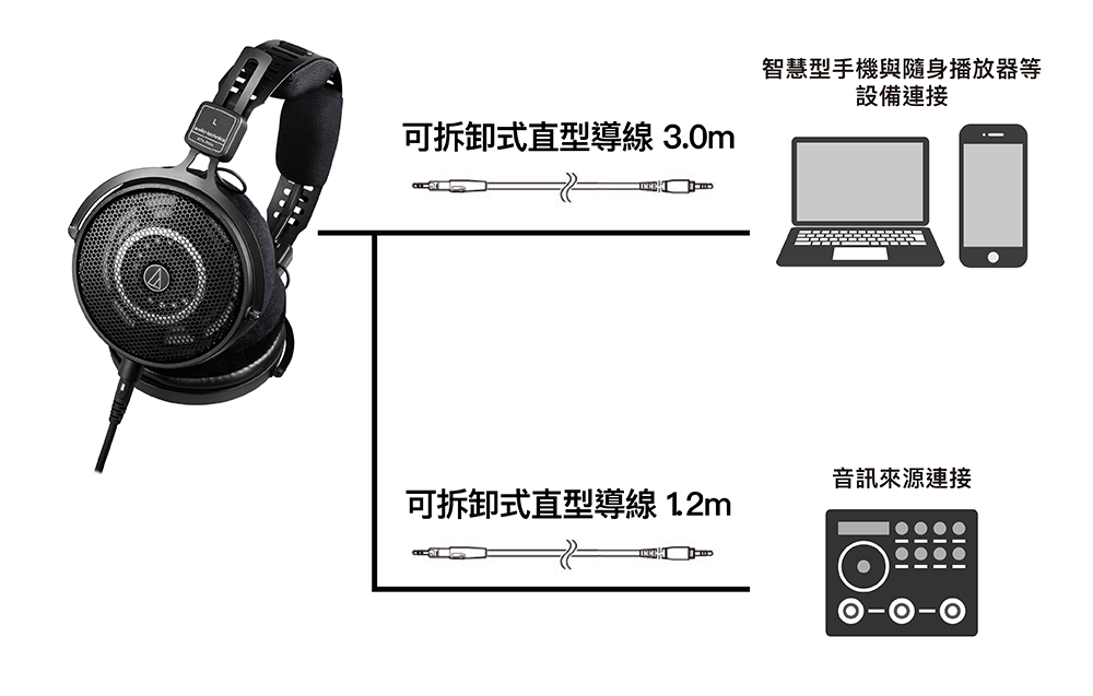 隨附一條長度 3.0m 的可拆卸式導線,配有Ø2.5mm 連接端子和 Ø3.5mm 鍍金立體聲迷你立體聲插頭,滿足使用者的多樣需求。