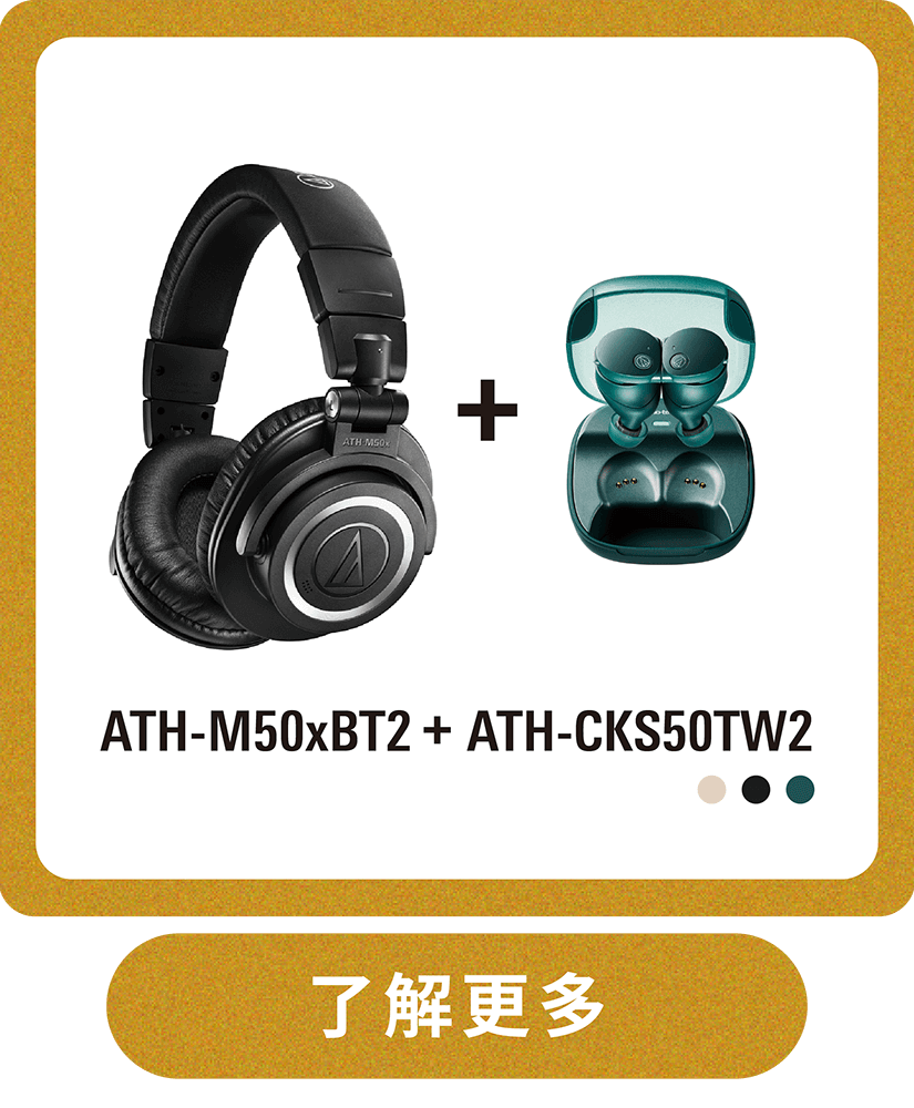 2025年11月11日起至12月31日為止,凡購買ATH-M50xBT2無線耳罩式耳機和ATH-CKS50TW2真無線耳機,原組合定價NT$11,280元,限時組合價NT$8,800元。現在就來進化你的聆聽體驗!