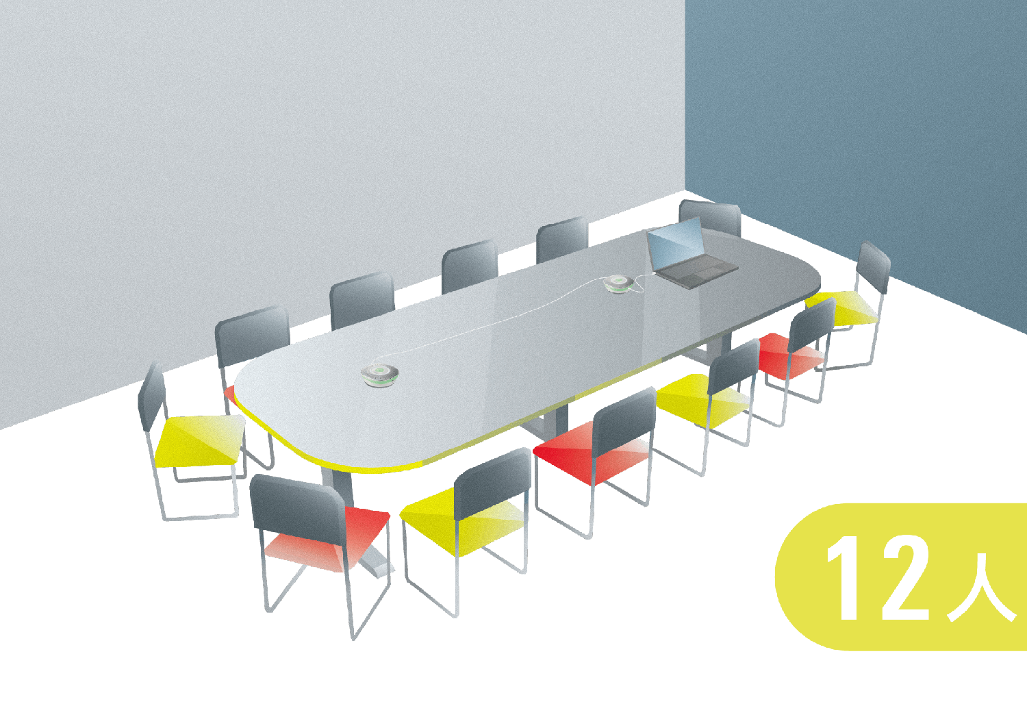 建議使用距離為半徑1公尺內(最遠不超過2公尺),建議使用人數最多為6人。如將兩台產品以串聯方式使用,最多可供12人同時使用。在大型會議室中使用時,不僅無需提高音量說話,每個座位也都能清楚聽見聲音。
