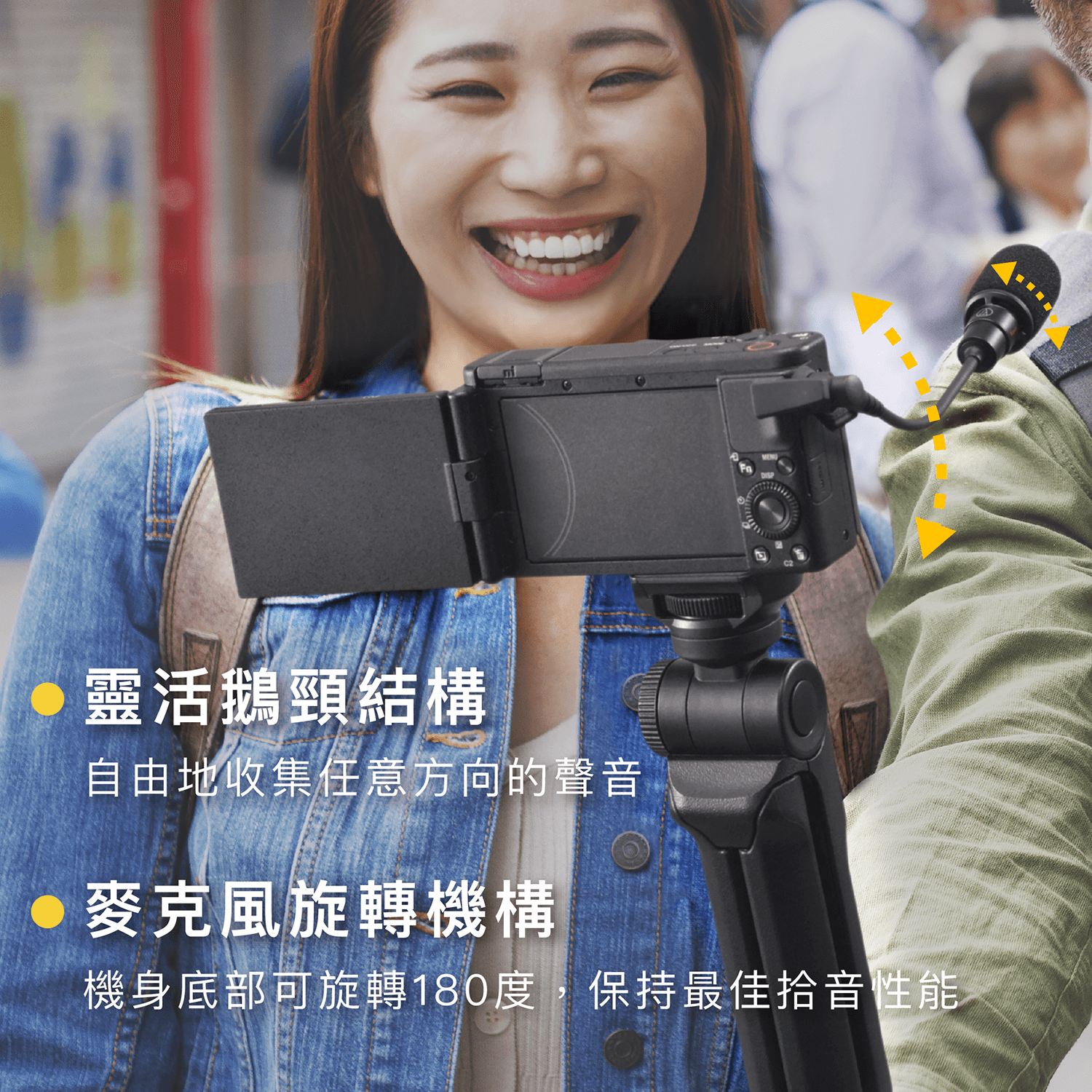 可隨意調整的鵝頸設計,不僅可以收集相機鏡頭朝向的聲音,還可以收集鏡頭以外方向的聲音,十分適合自拍。透過將麥克風調整到想要收音的方向,能確認收錄聲音的音量與聲音品質的穩定。