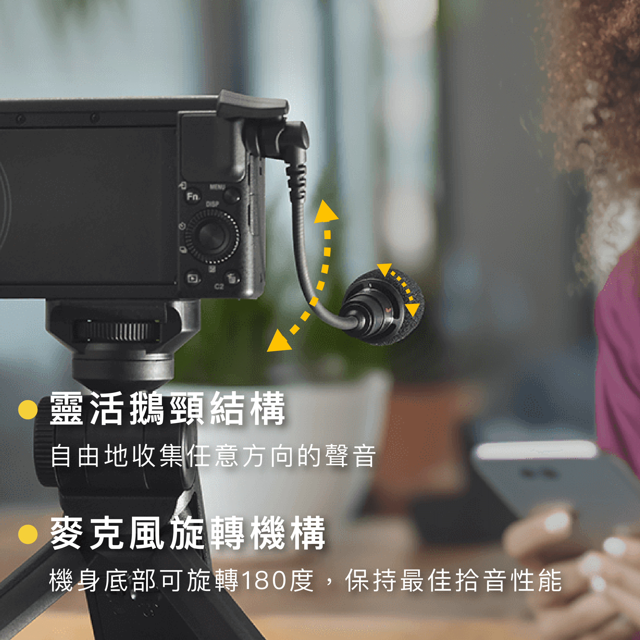 可隨意調整的鵝頸設計,不僅可以收集相機鏡頭朝向的聲音,還可以收集鏡頭以外方向的聲音,十分適合自拍。