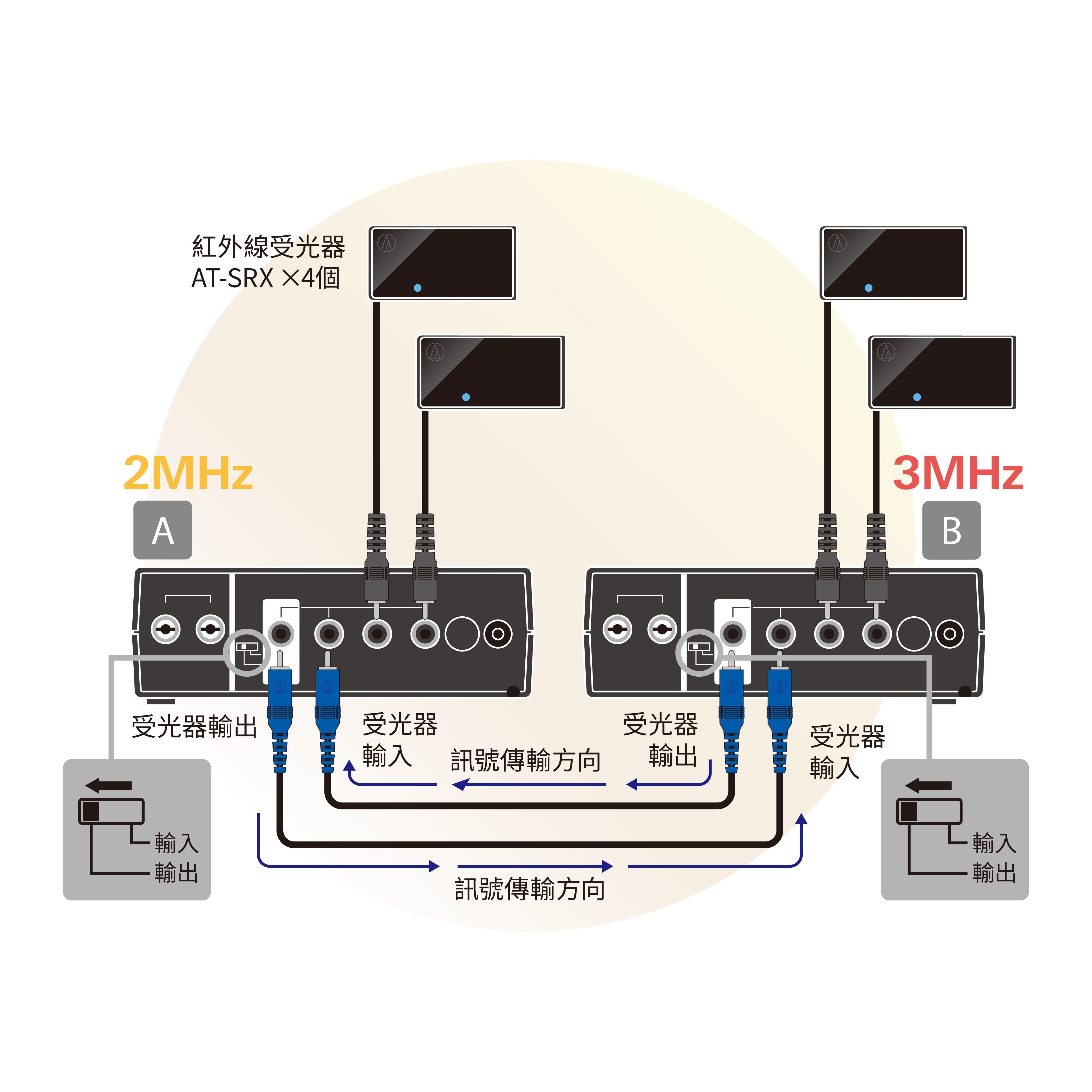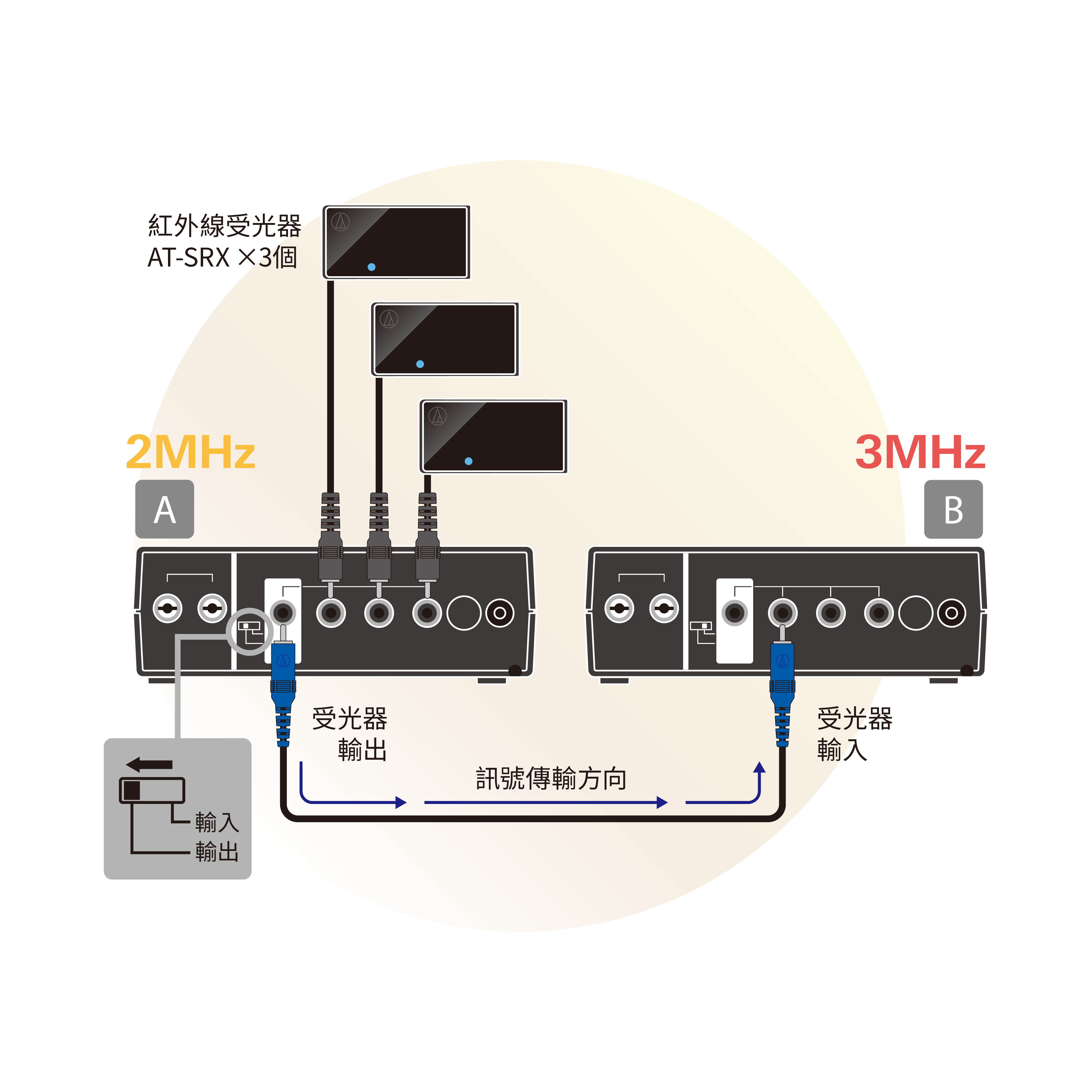 使用一條專用連接導線AT-CAS1,將接收器A從各紅外線受光器處所接收的訊號傳輸至接收器B。