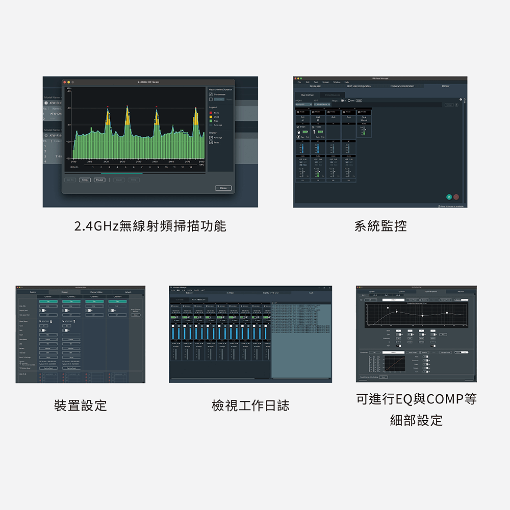 Wireless Manager是一款為輔助鐵三角產品進行無線操作的專屬應用程式。使用此專屬應用程式,便能於線下進行裝置設定或頻率規劃。另外,應用程式與裝置在線連接時,也可以導入設定。在線連接時除了能夠掃描現場的無線射頻環境、監控系統運作狀態與查看系統日誌,也可將充電器連接到網路線上,確認充電狀態,集中管理所有無線系統。主要功能如下: