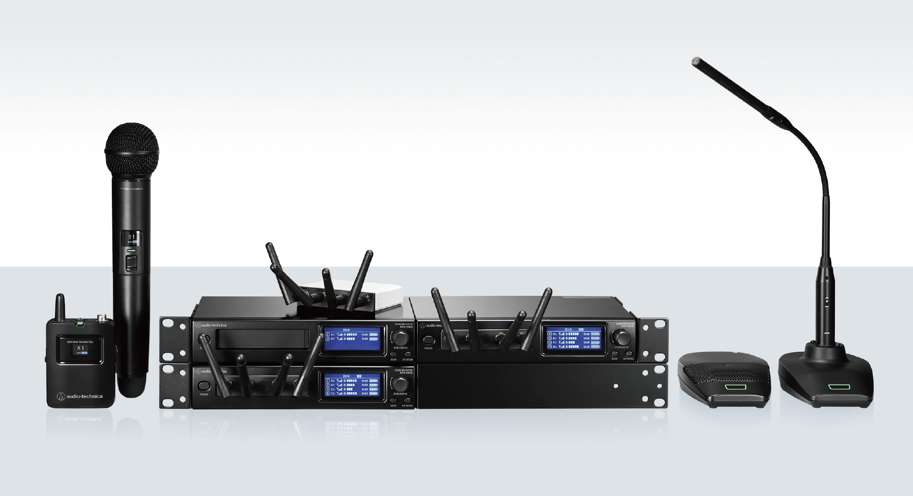 本套組含內容如下:接收器(ATW-R1440)×1、腰掛式發射器(ATW-T1401)×1、手握式發射器(ATW-T1402)×1