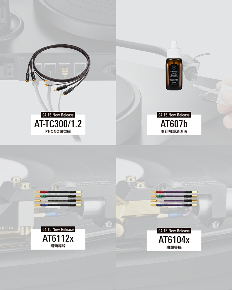 讓黑膠聆聽的過程更顯細膩層次,鐵三角全新推出多款黑膠相關配件,包括 AT-TC300/1.2 PHONO訊號線、AT607b 唱針唱頭清潔液,以及 AT6112x、AT6104x 唱頭導線。透過配件的更換與日常維護,全面提升黑膠聆聽的整體質感與完成度。