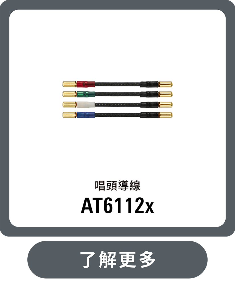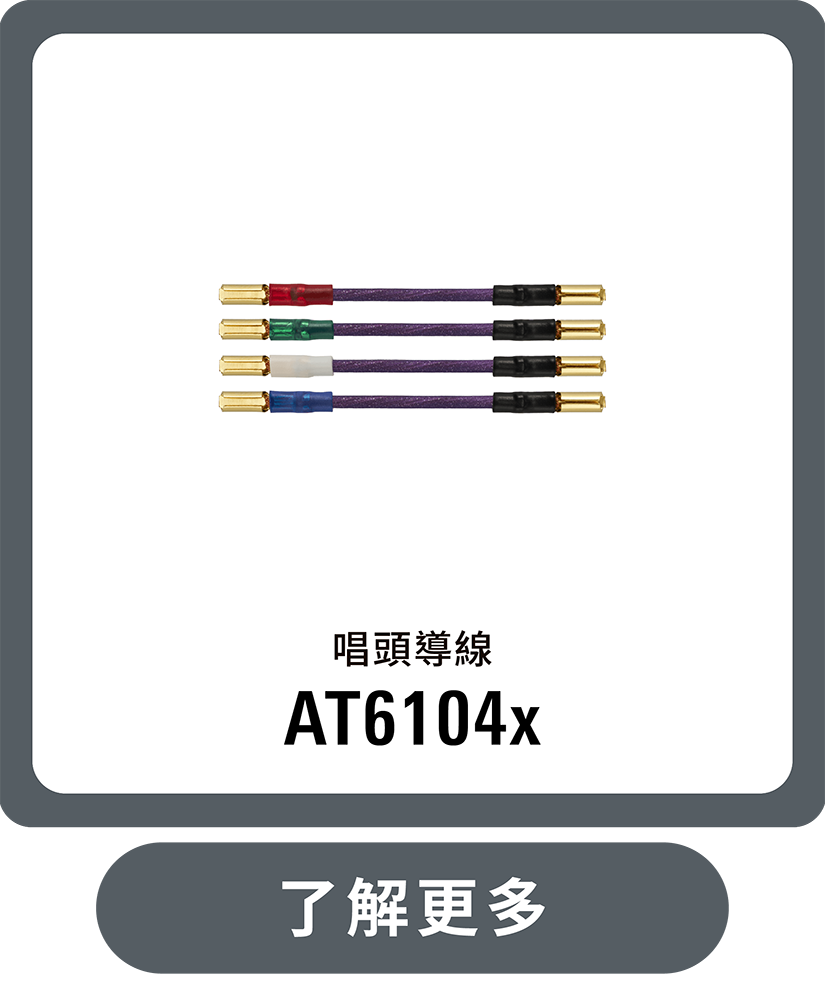 AT6112x、AT6104x 唱頭導線分別採用 7N-Class D.U.C.C. 與 PCUHD 導體材質,展現各自細緻而富層次的聲音表現,透過不同材質特性,勾勒出多元且富有魅力的黑膠聲音樣貌,讓聆聽體驗更加完整而耐聽。