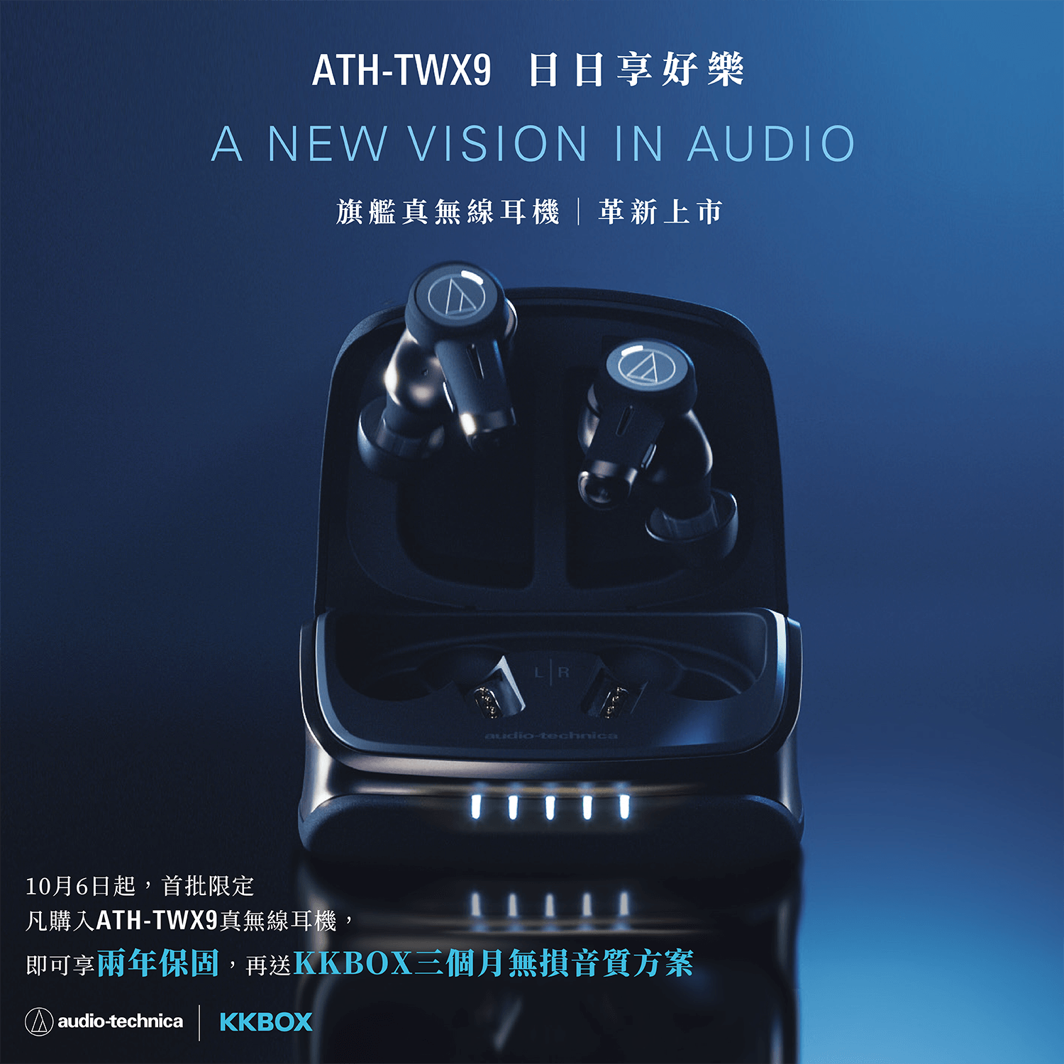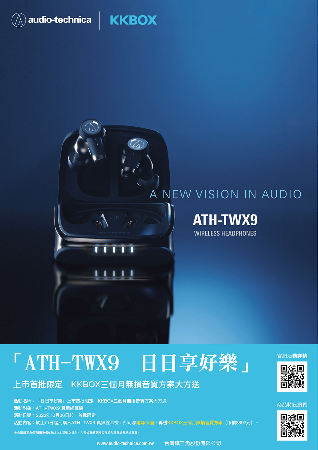 活動內容:於上市日起凡購入ATH-TWX9 真無線耳機,即可享兩年保固,再送KKBOX三個月無損音質方案(市價$897元)。