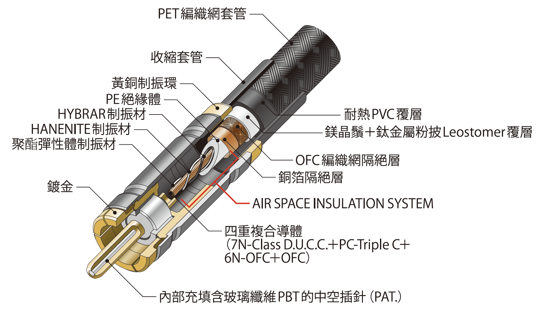 - 經過特殊精密加工的中空插針內部,充填加入了玻璃纖維的PBT,抑制多餘振動,使音質得到提升 (PAT.)。