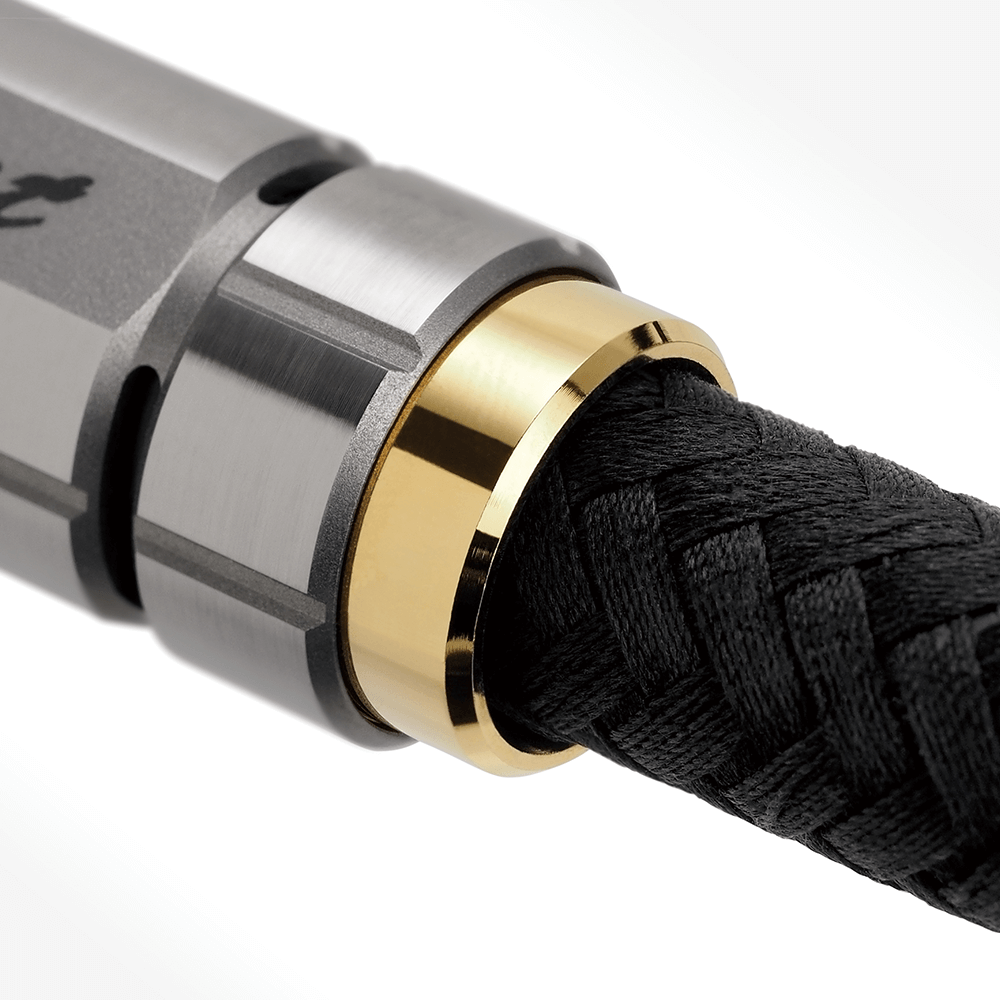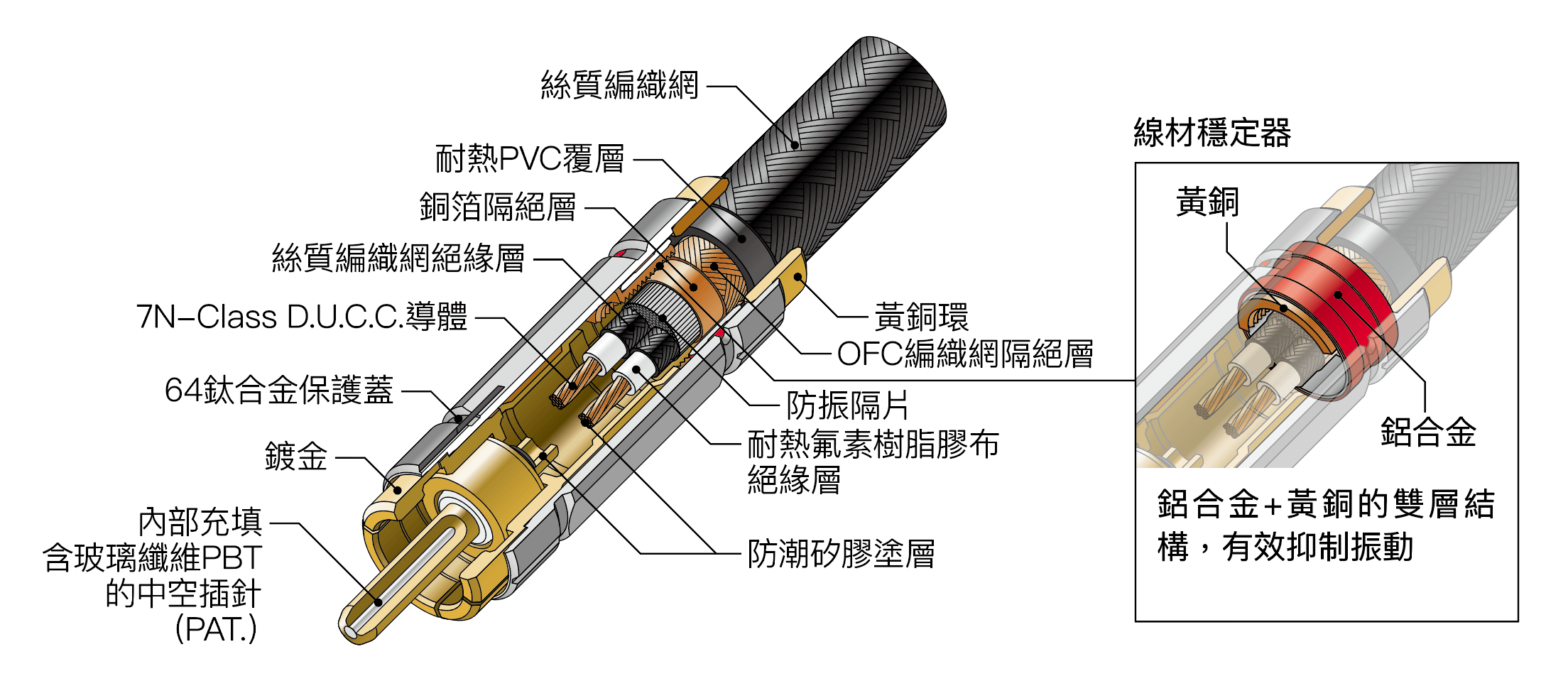 - 兼具優雅感觸與高級咸的絲質編織線材覆層,有效抑制線材整體的有害振動。
