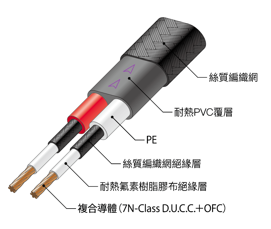 - 採用世界最高水準的高純度銅7N-ClassD.U.C.C.+OFC的複合導體。