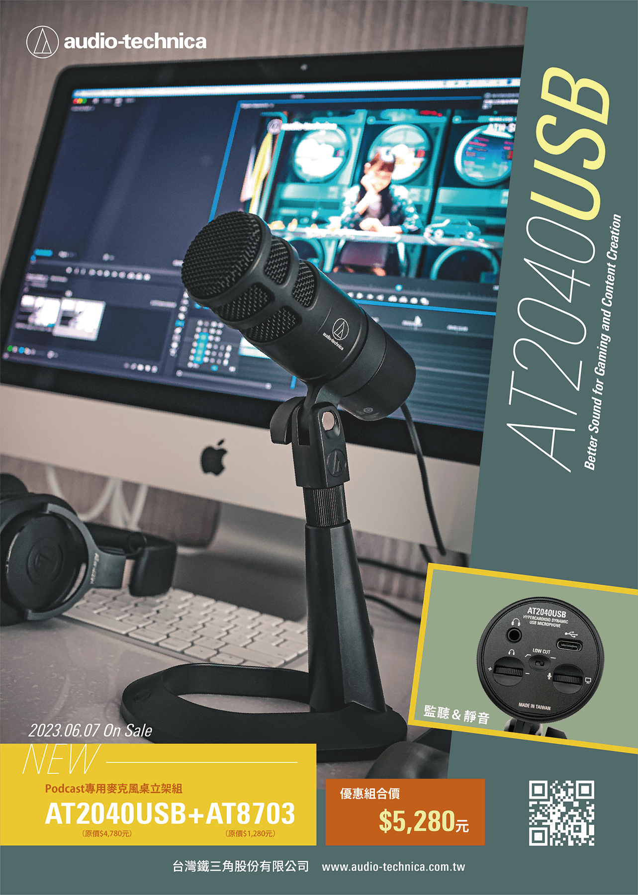活動辦法:凡同時購入AT2040USB Podcast用超心形指向性USB麥克風、AT8703 麥克風立架(組合名:AT2040USB+AT8703 Podcast專用麥克風桌立架組),原價6,060元,立即享整組優惠價5,280元帶回家,直接現省780元!