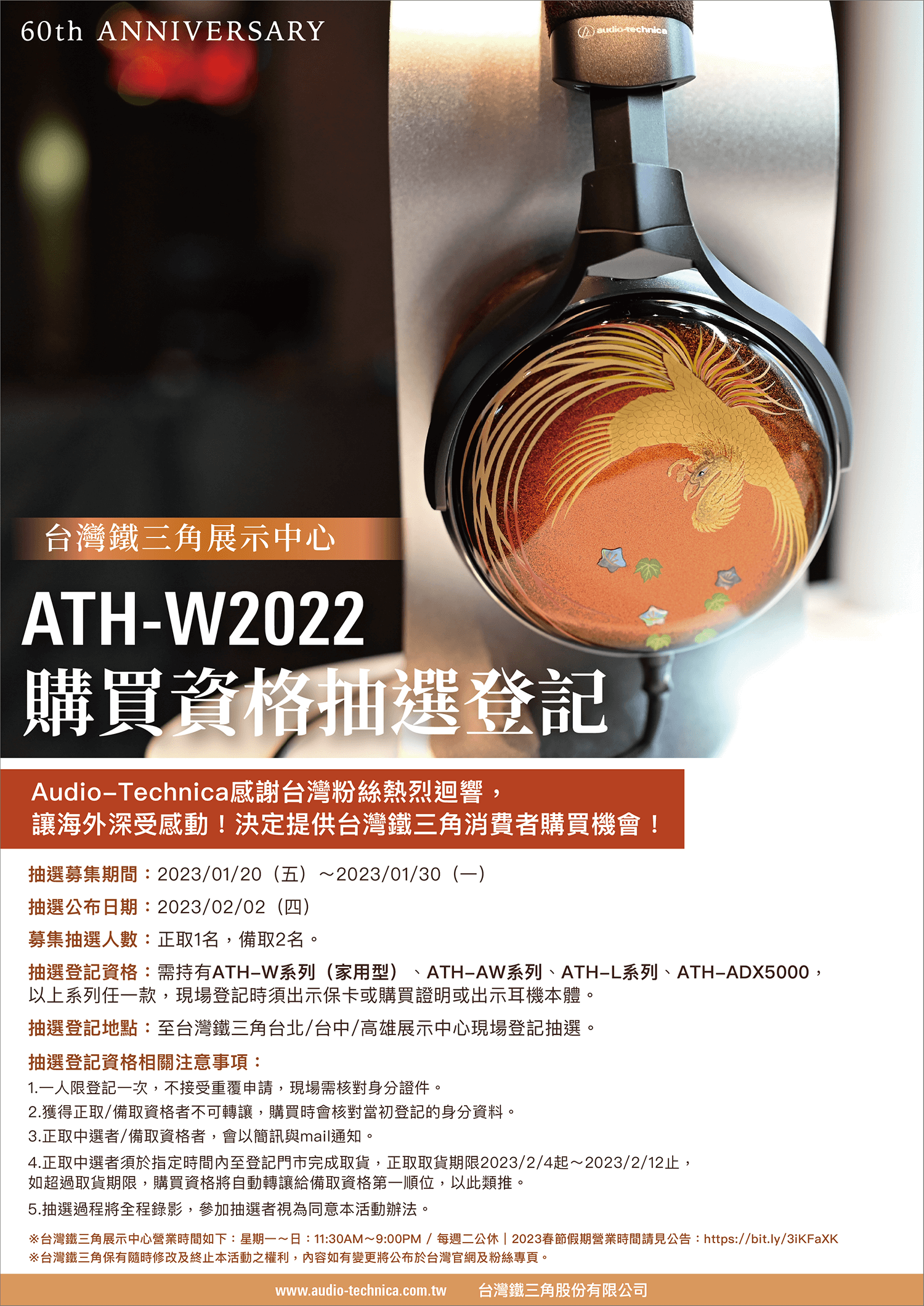 抽選登記資格:需持有ATH-W系列(家用型)ATH-AW系列ATH-L系列ATH-ADX5000,以上系列任一款,現場登記時須出示保卡或購買證明或出示耳機本體。