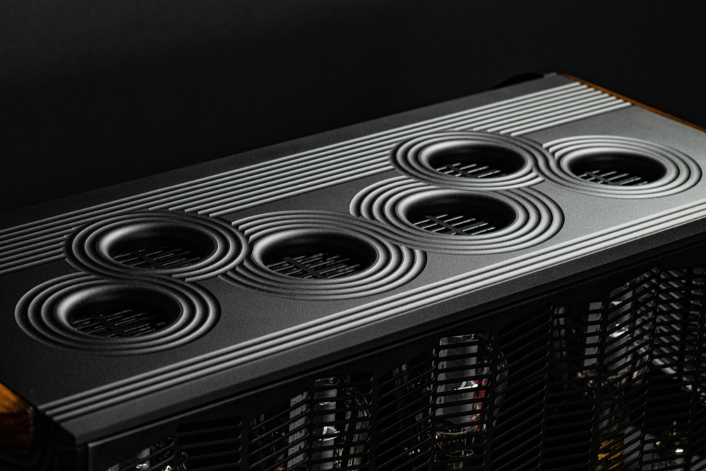鳴神擴⼤機採⽤了⿊柿木,這種稀有的⾃然奇蹟是透過百年以上的時間,形成了獨特的⽔墨畫般紋路。由於質地特殊使得木材乾燥過程⾮常複雜,只有⽼練的⼯匠有能⼒處理⿊柿木。而點綴在擴⼤機頂部的精緻圖案,靈感來⾃「枯⼭⽔」,⼀種傳統庭園造景。圖案沿著擴⼤機的兩側延伸,象徵了流動以及代表無限的符號(∞)。而8在亞洲⽂化中也帶有吉利的意味。
