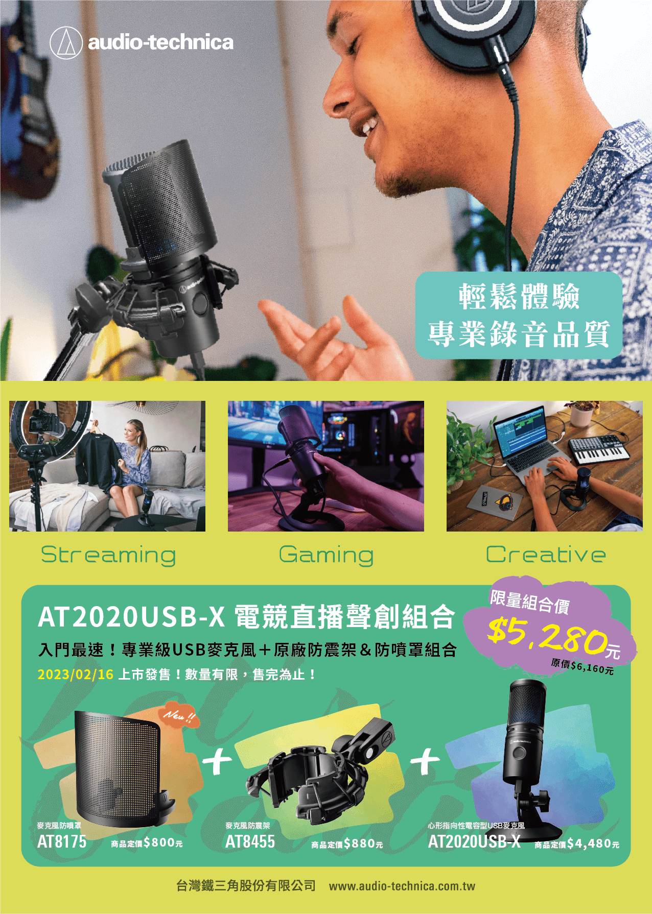 活動辦法:凡同時購入AT2020USB-X心形指向性電容型USB麥克風、AT8455麥克風防震架、AT8175麥克風防噴罩共三件(組合名:AT2020USB-X+AT8455 +AT8175電競直播聲創組合),原價6,160元,立即享整組優惠價5,280元帶回家,直接現省800元!