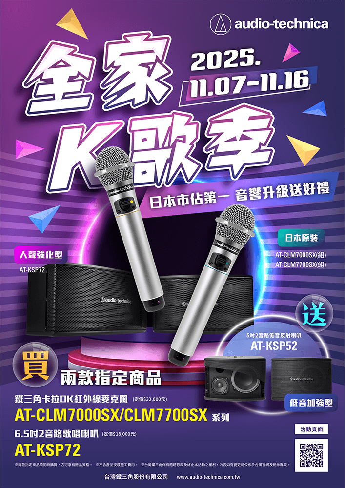 活動型號:鐵三角卡拉OK紅外線麥克風 AT-CLM7000SX/CLM7700SX系列(定價$32,000元)、6.5吋2音路歌唱喇叭 AT-KSP72(定價$18,000元)