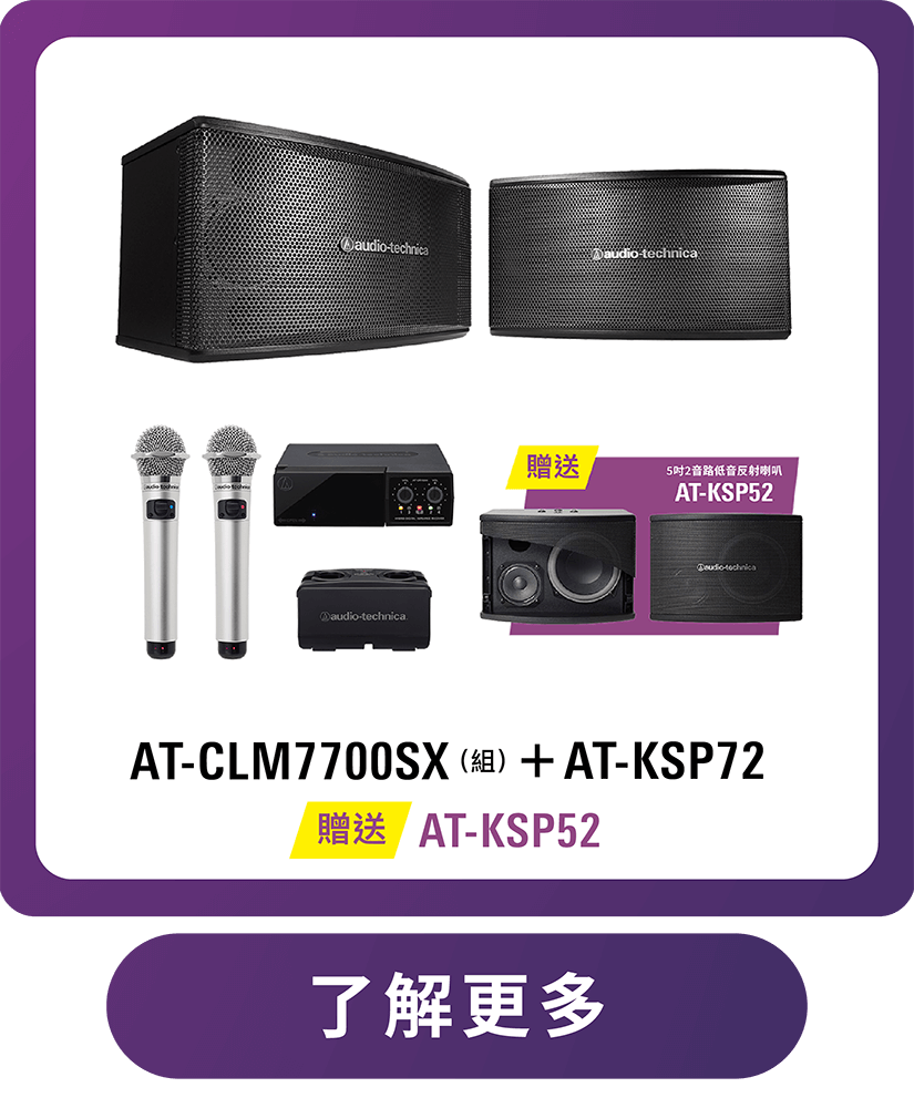 活動期間內,凡同時購入鐵三角卡拉OK紅外線麥克風AT-CLM7000SX/CLM7700SX系列(定價$32,000元)與6.5吋2音路歌唱喇叭AT-KSP72(定價$18,000元),即贈送5吋2音路低音反射喇叭AT-KSP52(定價$15,000元)一對。