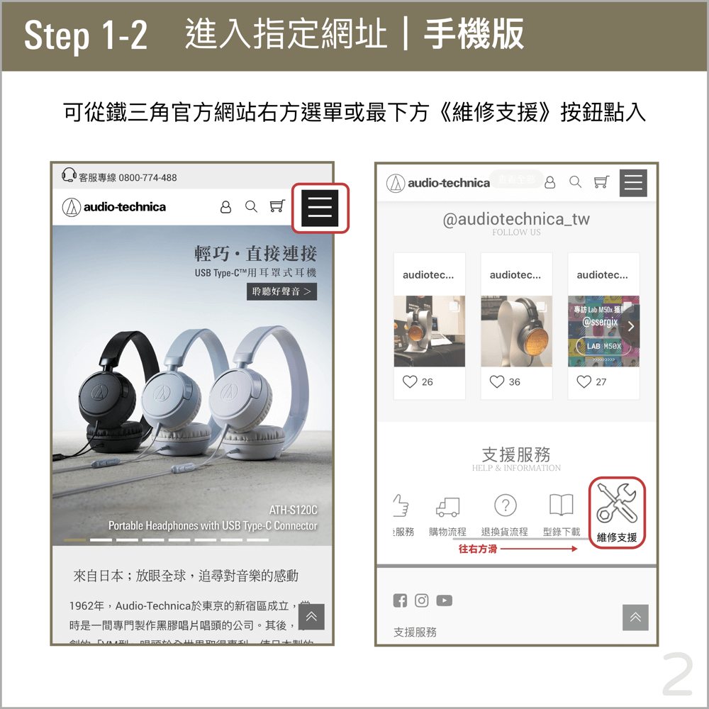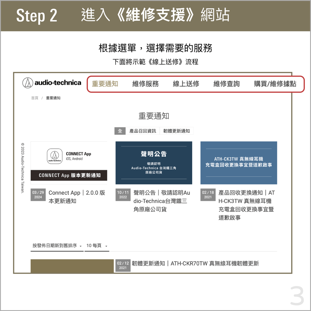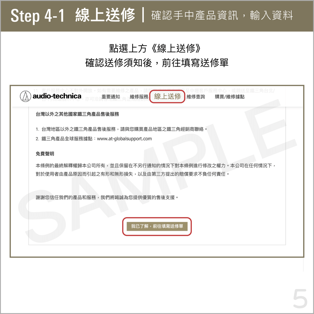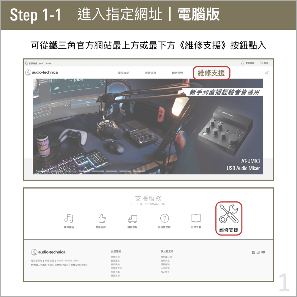 ➊ 親自至台灣鐵三角官網——【維修支援】→【線上送修】,登錄線上送修單者: