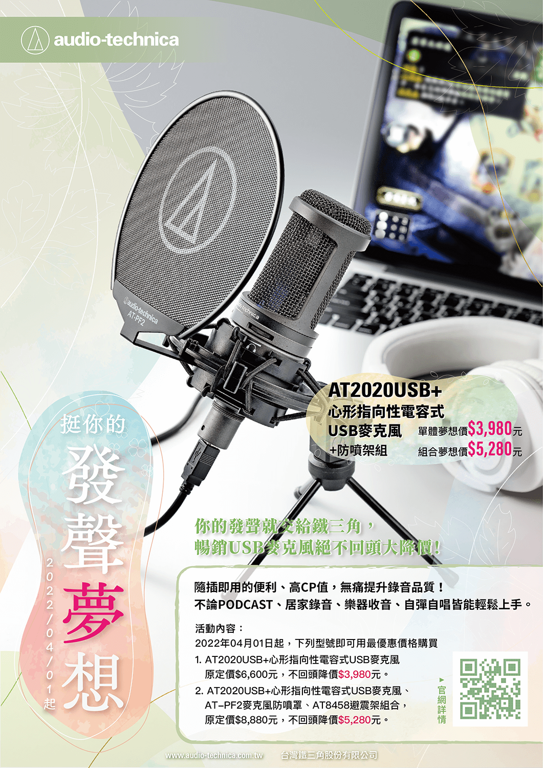 了解更多「AT2020USB+心形指向性電容式USB麥克風、AT-PF2麥克風防噴罩、AT8458避振架組合」商品資訊>>