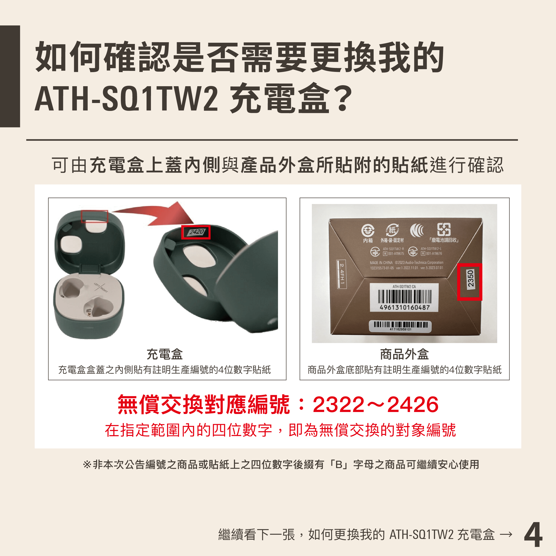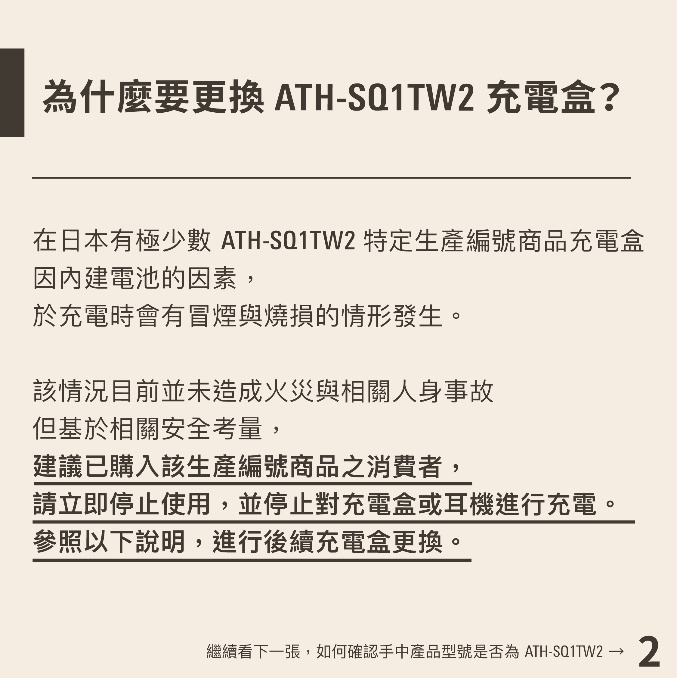 有關2023年4月發售的真無線耳機「ATH-SQ1TW2」,經日本本社確認有極少數特定生產編號的商品充電盒因內建電池的因素,於充電時會有冒煙與燒損的情形發生,造成各位的困擾,十分抱歉。