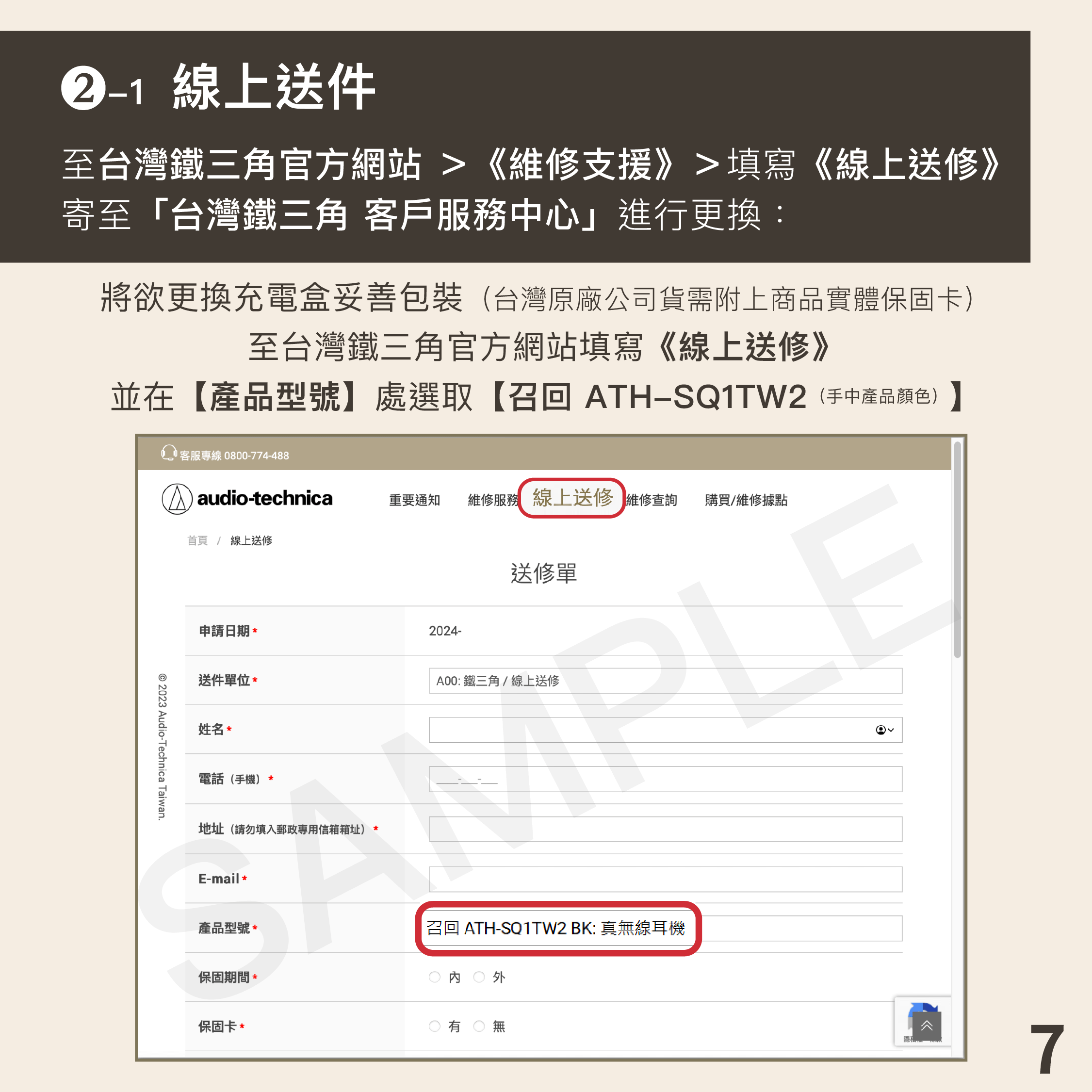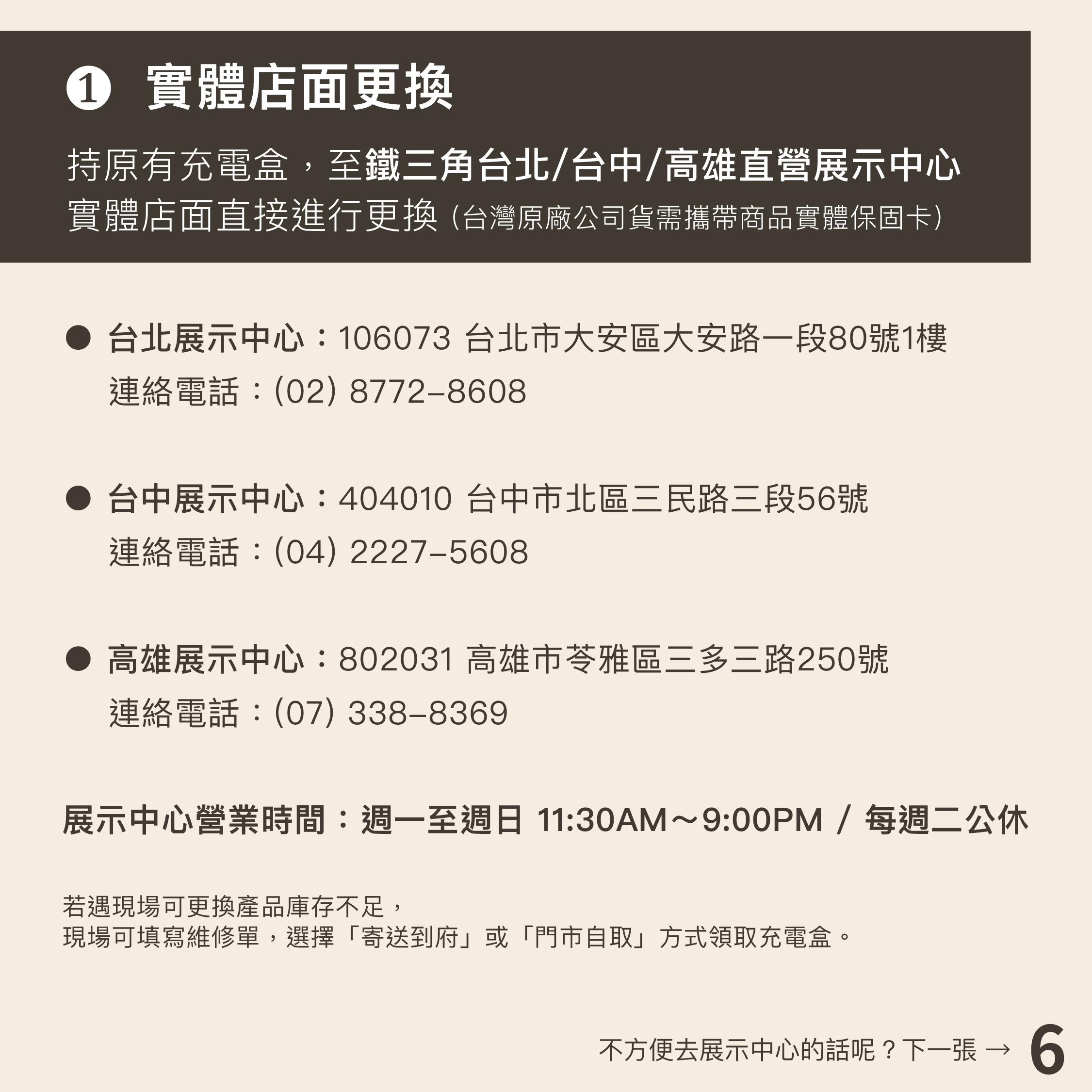 針對已購入該商品之消費者,敝公司於下方公告充電盒相關交換事宜,海內外購買之對象商品皆受理此交換服務,購入台灣原廠公司貨之消費者將提供商品全新一年保固(需附上商品實體保固卡)。有交換需求的消費者可參照下方步驟,於台灣鐵三角官方網頁之「線上維修申請」進行登記或聯繫「直營展示中心」與「客戶服務中心」協助充電盒之交換。