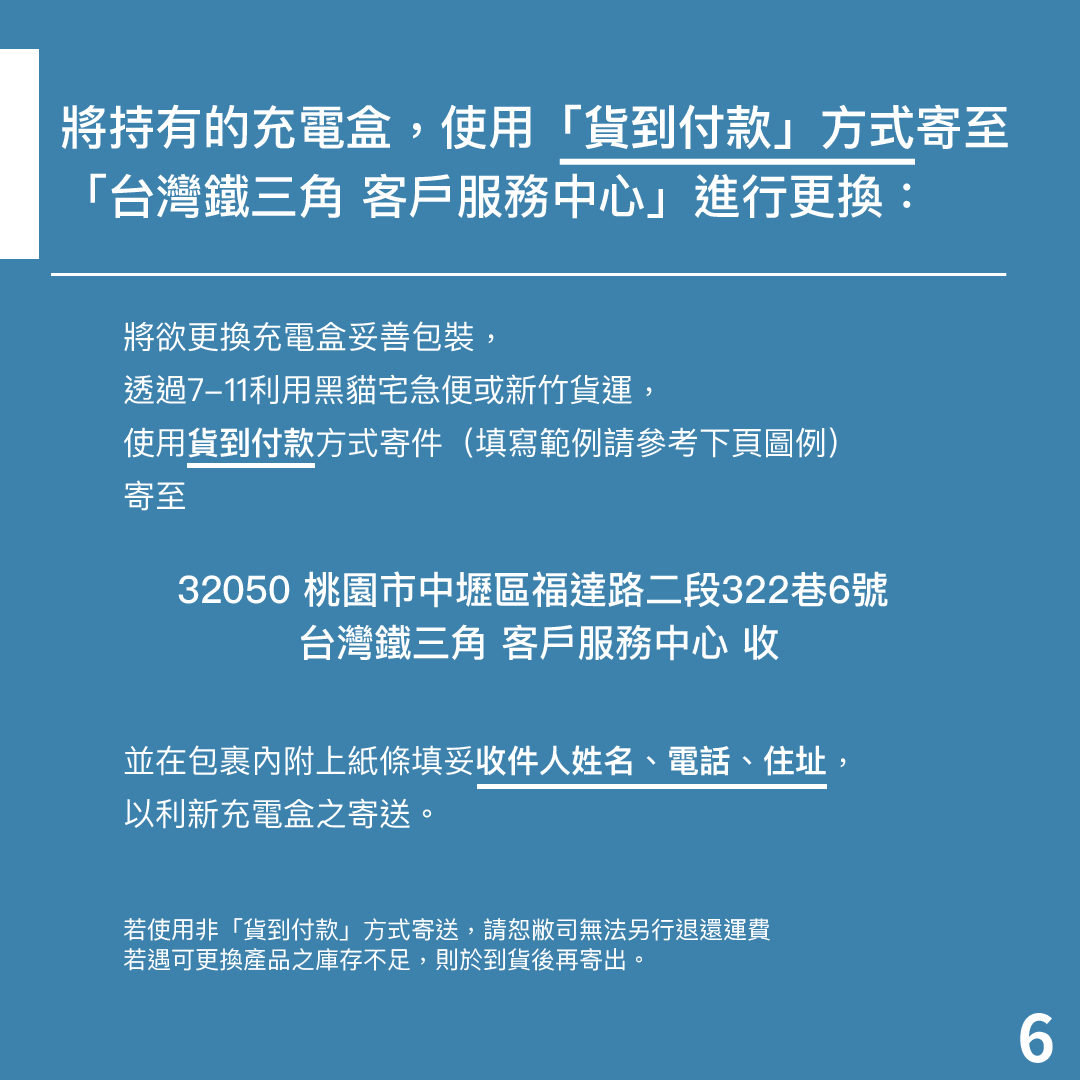 本次更換事宜皆由台灣鐵三⾓進⾏後續處理,有交換需求的消費者可參照下方步驟,於台灣鐵三角官方網頁之「線上維修申請」登記交換充電盒。