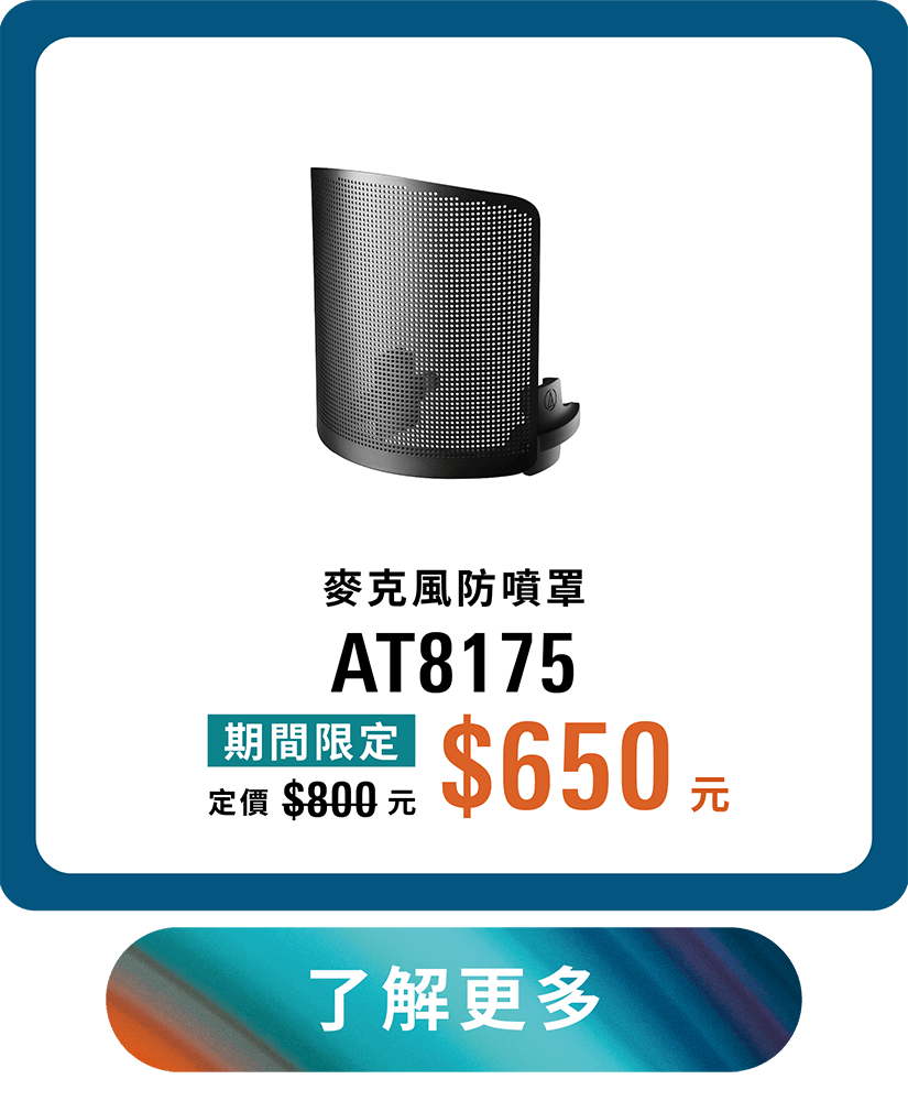 活動內容:於期間內購買下列指定商品,即享有期間限定價。AT8703 麥克風立架 期間限定價NT$990元(定價NT$1,280元)、AT8175 麥克風防噴罩 期間限定價NT$650元(定價NT$800元)