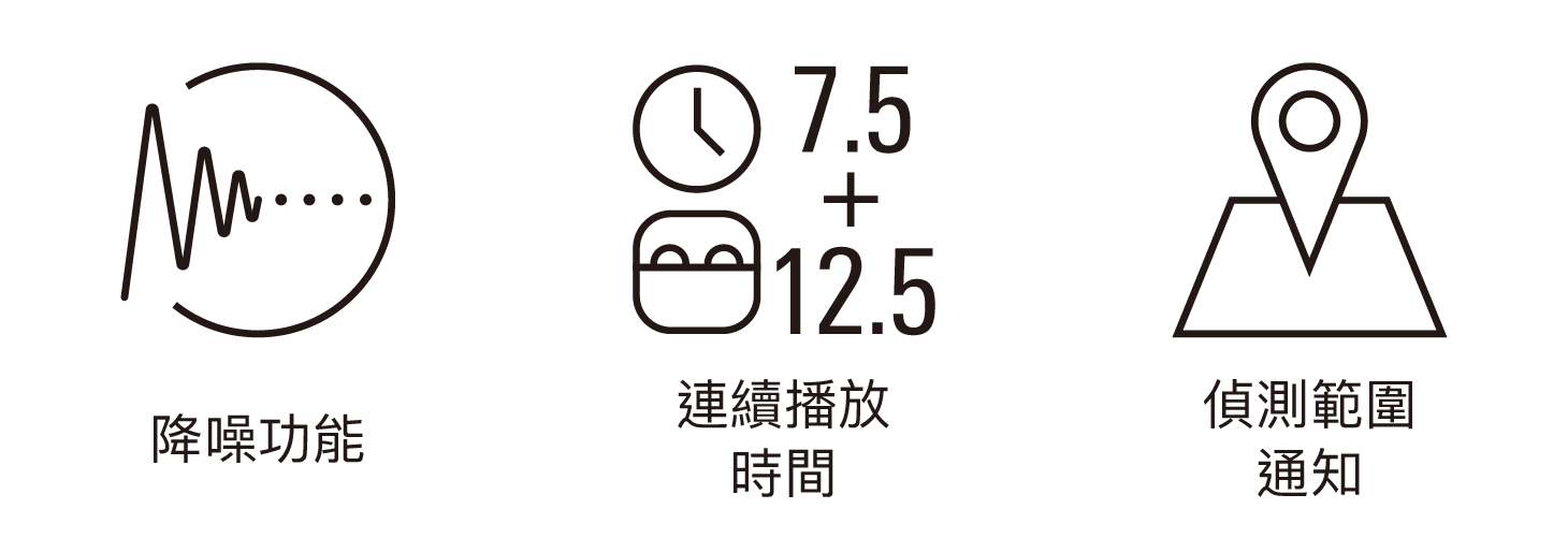 耳機與充電盒滿電時開啟降噪的情況下,耳機本體可連續使⽤約 6.5 ⼩時,搭配充電盒⼀起使⽤則可連續播放約 17.5 ⼩時。關閉降噪功能時,耳機本體播放時長可達 7.5 ⼩時,搭配充電盒⼀起使⽤時則可達 20 ⼩時。 *依據使⽤條件⽽異