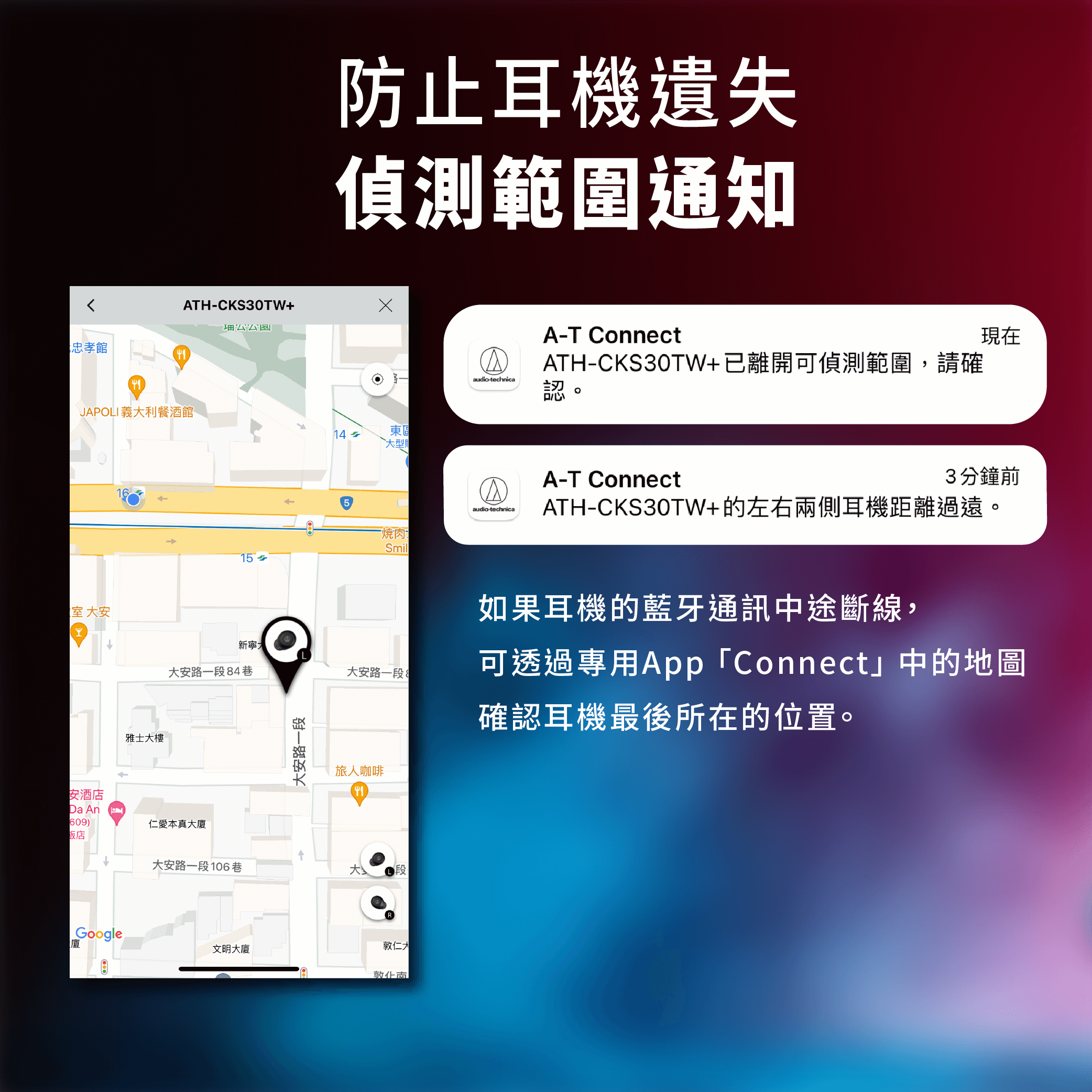 如果耳機的藍牙通訊中途斷線,可以透過專⽤ App「Connect」中的地圖確認耳機最後所在的位置,並於耳機遺失時的範圍內進⾏搜索。