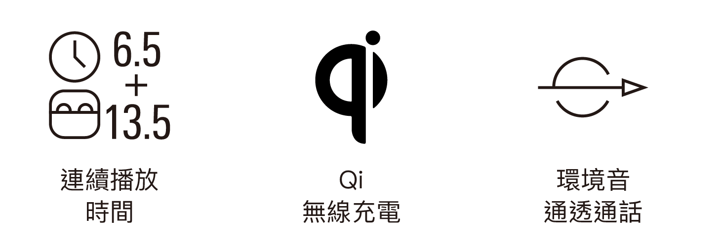 耳機充滿電的情況下,耳機可連續播放6.5小時,搭配充電盒使用可達20小時。