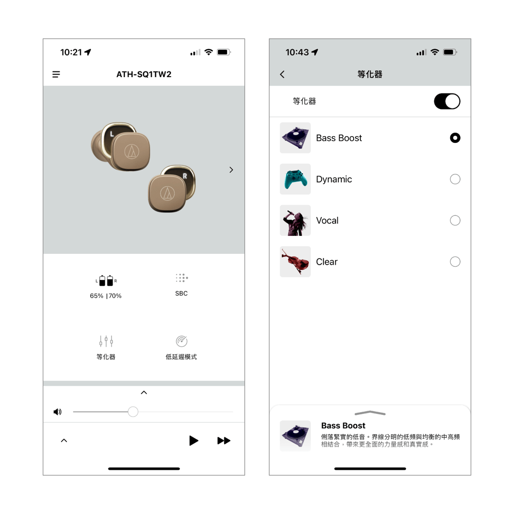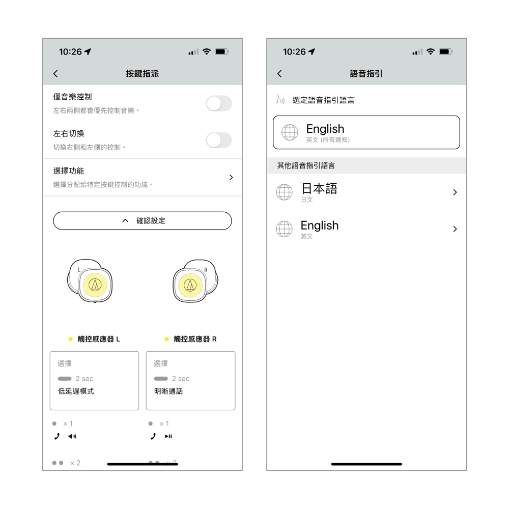 ▌可切換日語⇆英語雙語言的語音導引 選擇自己習慣聆聽的導引語言,享受與真無線耳機的每一天。 ▌可調整觸控感應器靈敏度 ▌4種預設EQ等化器 ▌音量調整等級 ▌防誤觸UI、觸摸面板鎖定系統 |