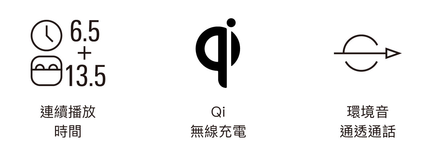 連續傳輸時間(音樂播放): 最高約6.5小時(僅耳機;降噪功能開啟)、 最高約7.5小時(僅耳機;降噪功能關閉)、 最高約20.0小時(充電盒+耳機;降噪功能開啟)、 最高約24.0小時(充電盒+耳機,降噪功能關閉)(依據使用條件而異)