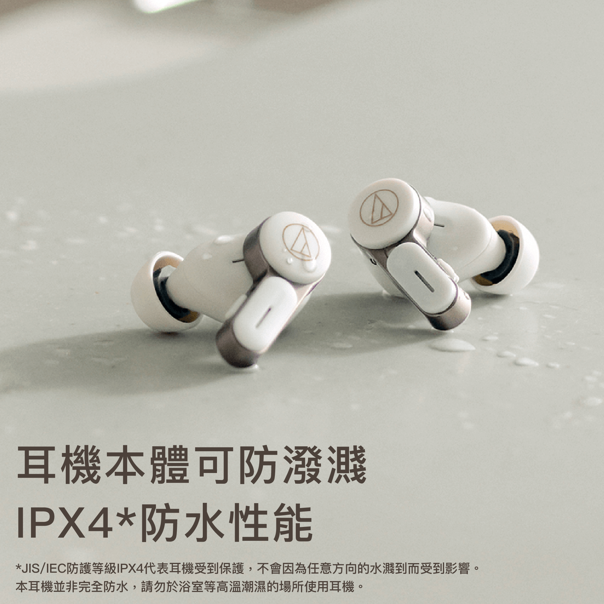 * JIS/IEC防護等級IPX4代表耳機受到保護,不會因為任意方向的水濺到而受到影響。本耳機並非完全防水,請勿於浴室等高溫潮濕的場所使用耳機。